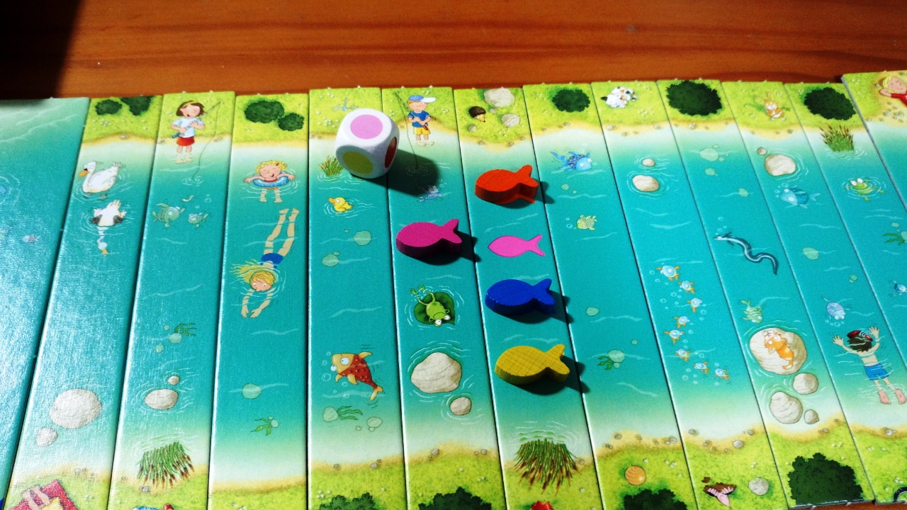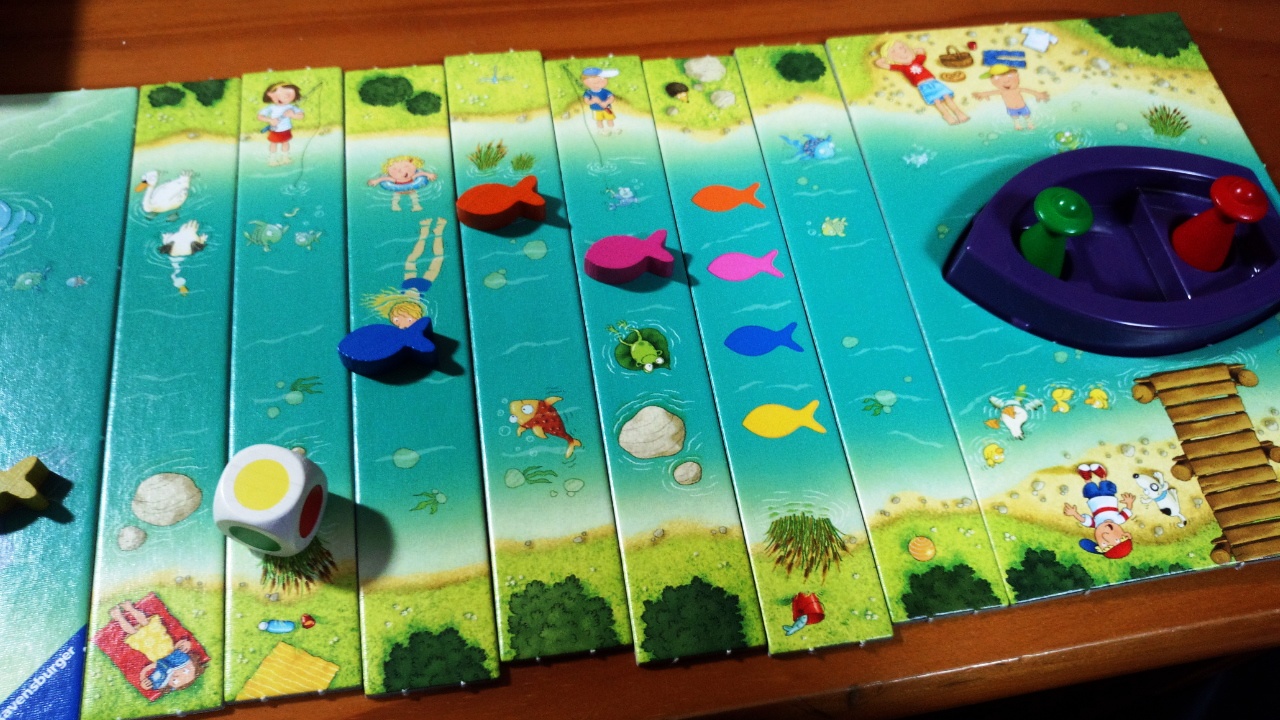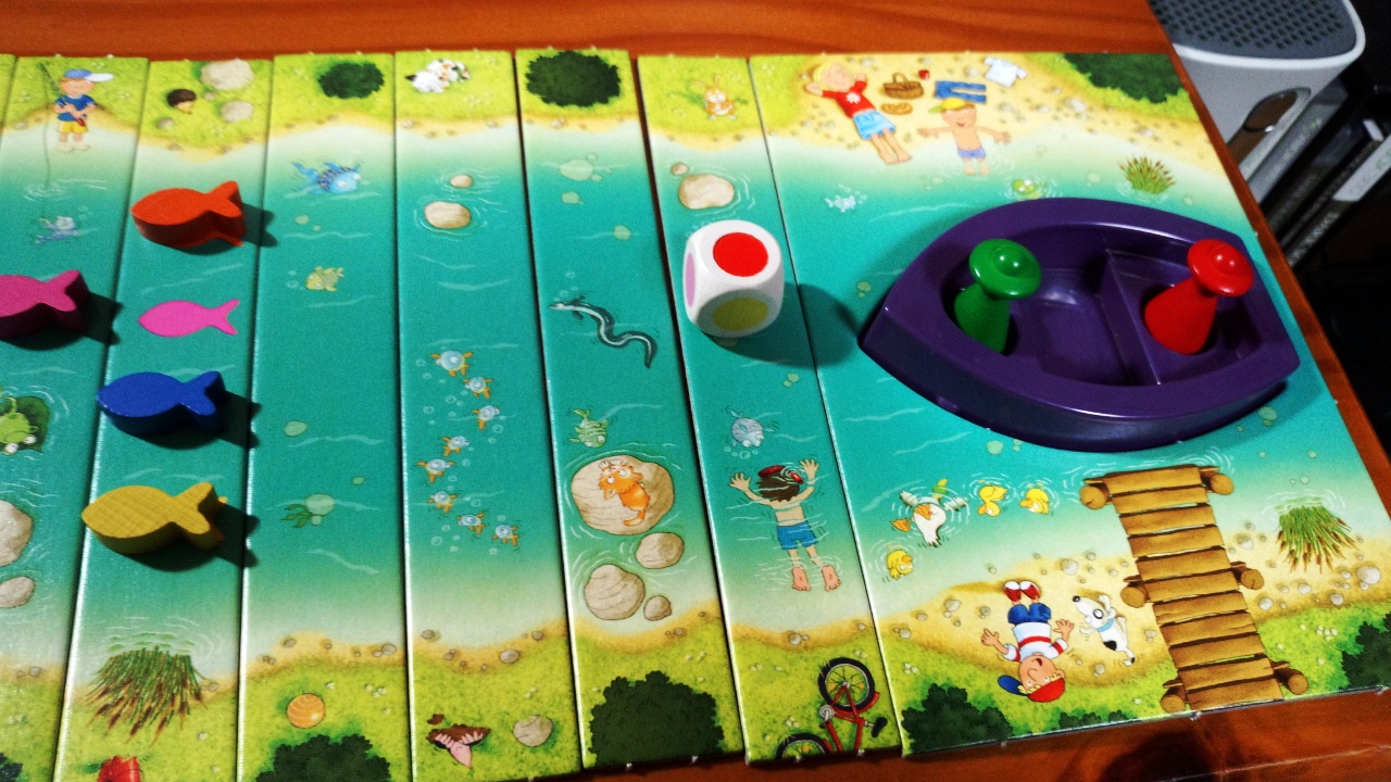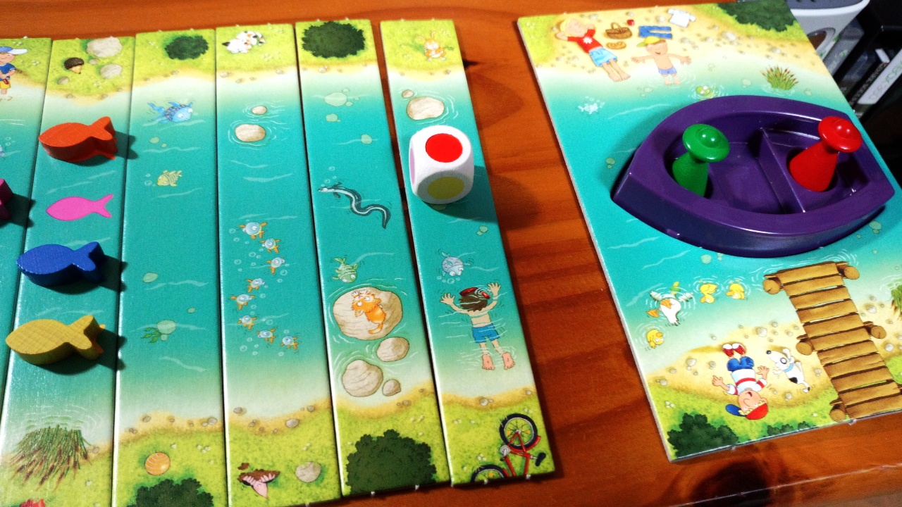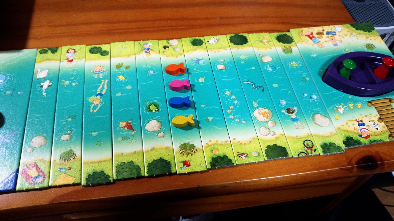 ボードをこのように並べ、魚が乗ったタイルを中央に配置します。船はタイルの穴にぴったり収まるようになっています。