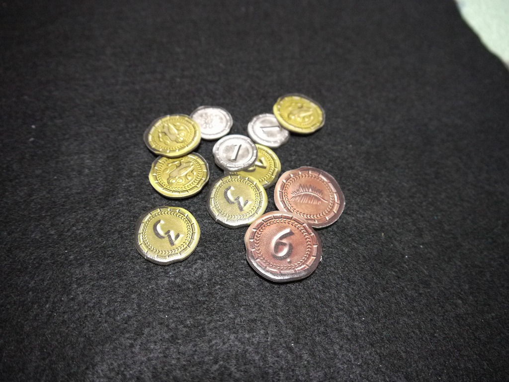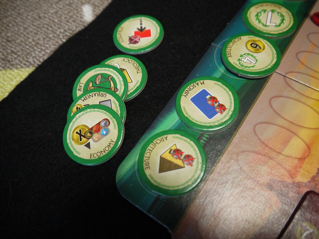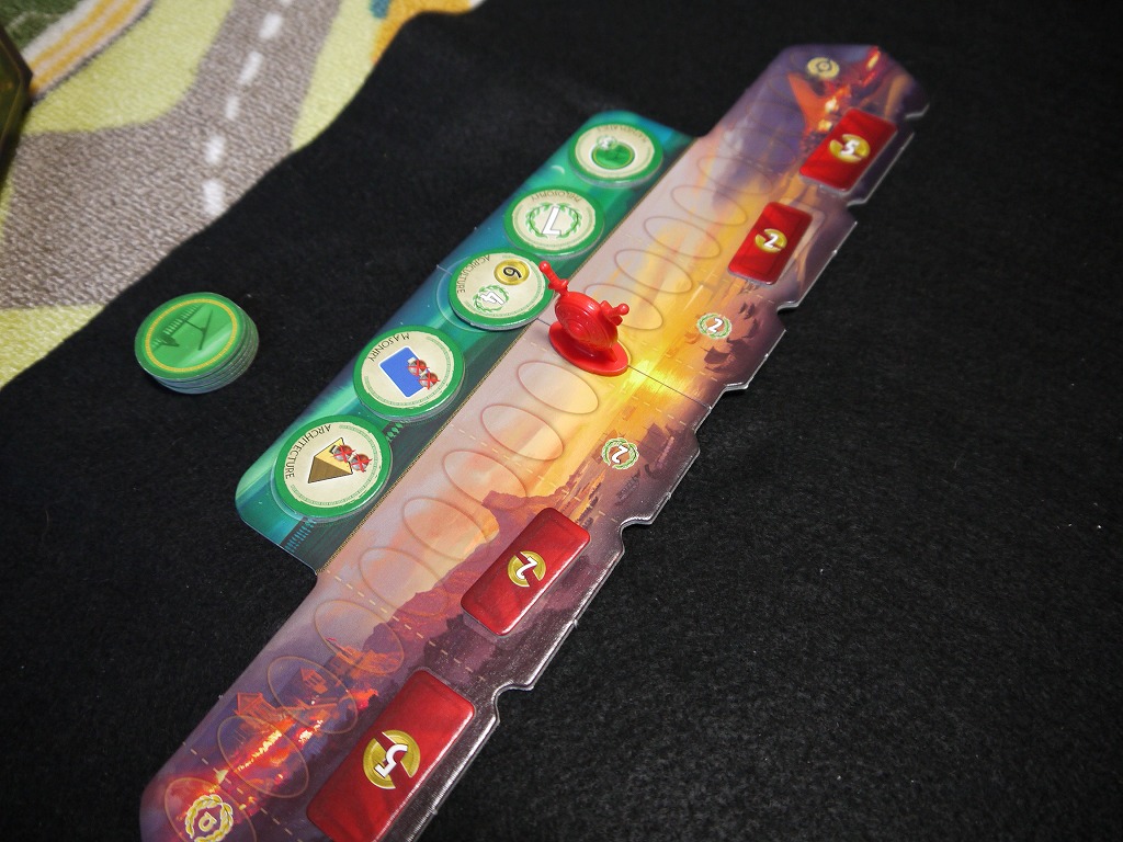 また、緑のカードに書かれているアイコンを2つ同種でそろえると、この緑色の丸いタイルをもらえます。単純に勝利点になったり、軍事力が増加しやすくなったりと効果は様々。