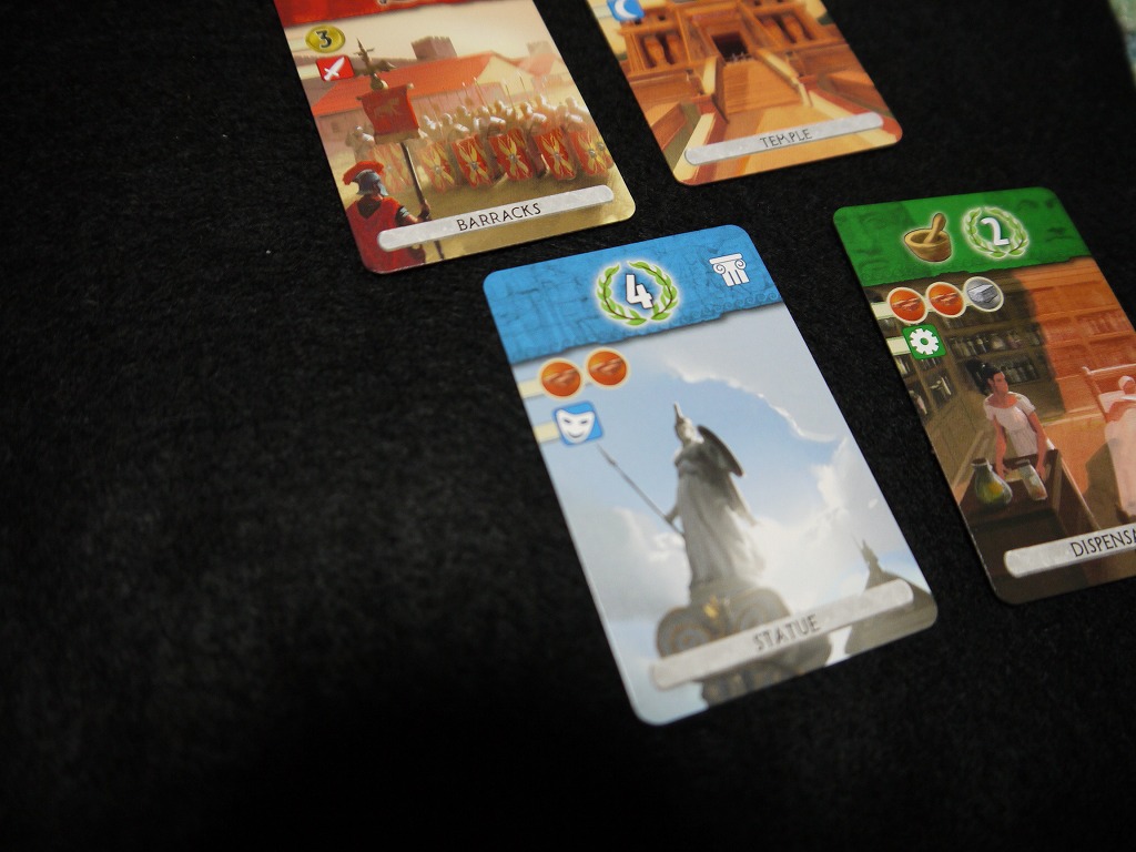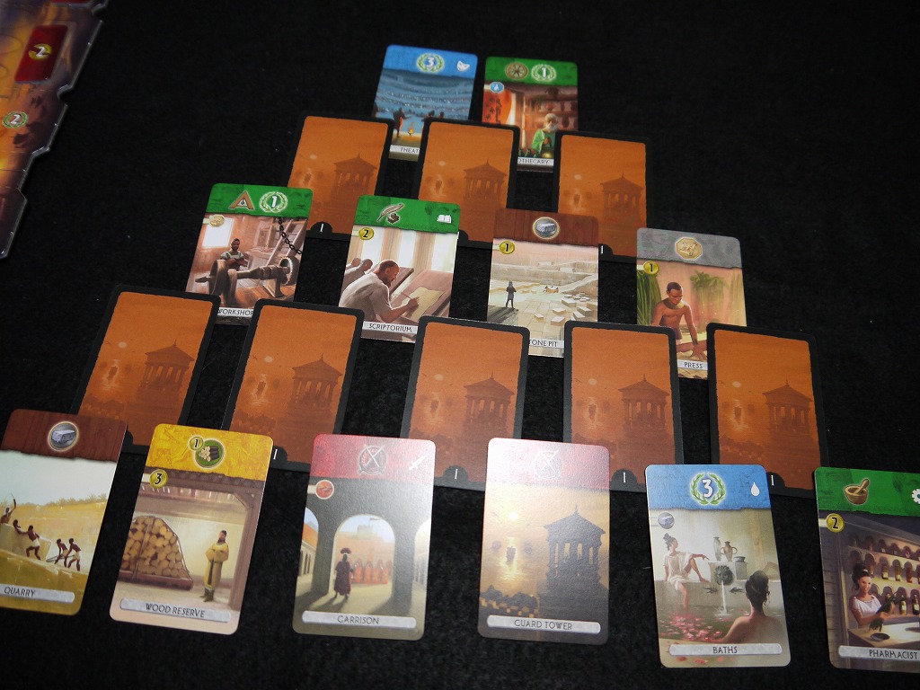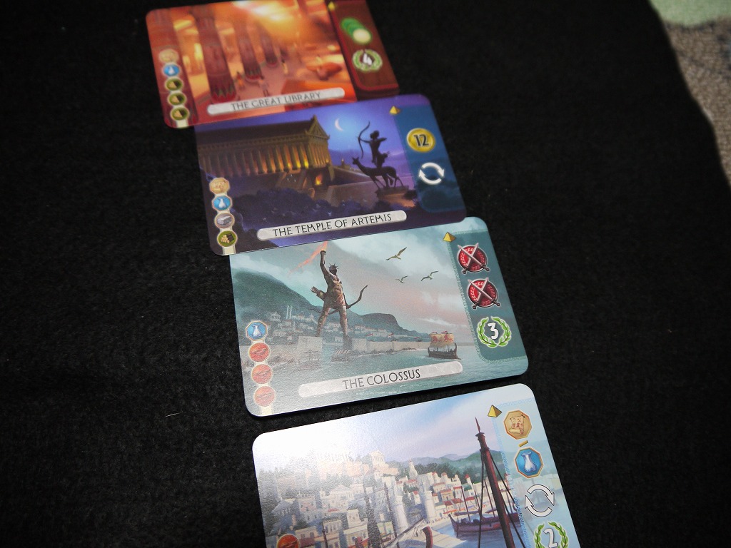 互いに4枚ずつ、合計8つのワンダーを持っているのですが、七不思議というだけあって、二人で合計7つまでしか建てられません。2人のうちどちらかは、最後まで建てきれないのです。