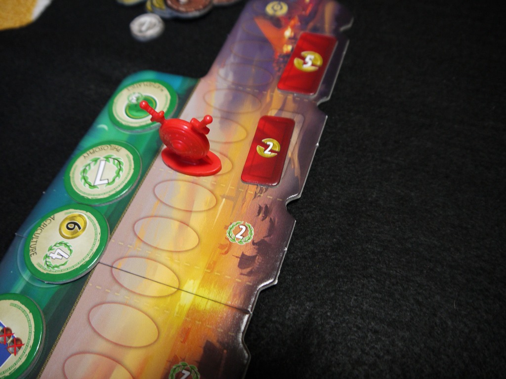 勝利点はゲーム終了後に入りますが、特定の場所まで到達すると相手のお金をストックに戻せます。(お金を破壊するアイコンが書いてあるトークンを取ります。)そして、一番奥まで押し込めると軍事的勝利です。