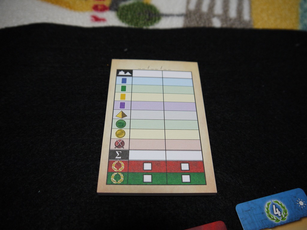 おなじみのスコアパッドを使って、各カード種別ごとに得点していきます。これで勝った場合は、「市民的勝利」というらしいですね。大体はこの得点で決着がつくと思います。