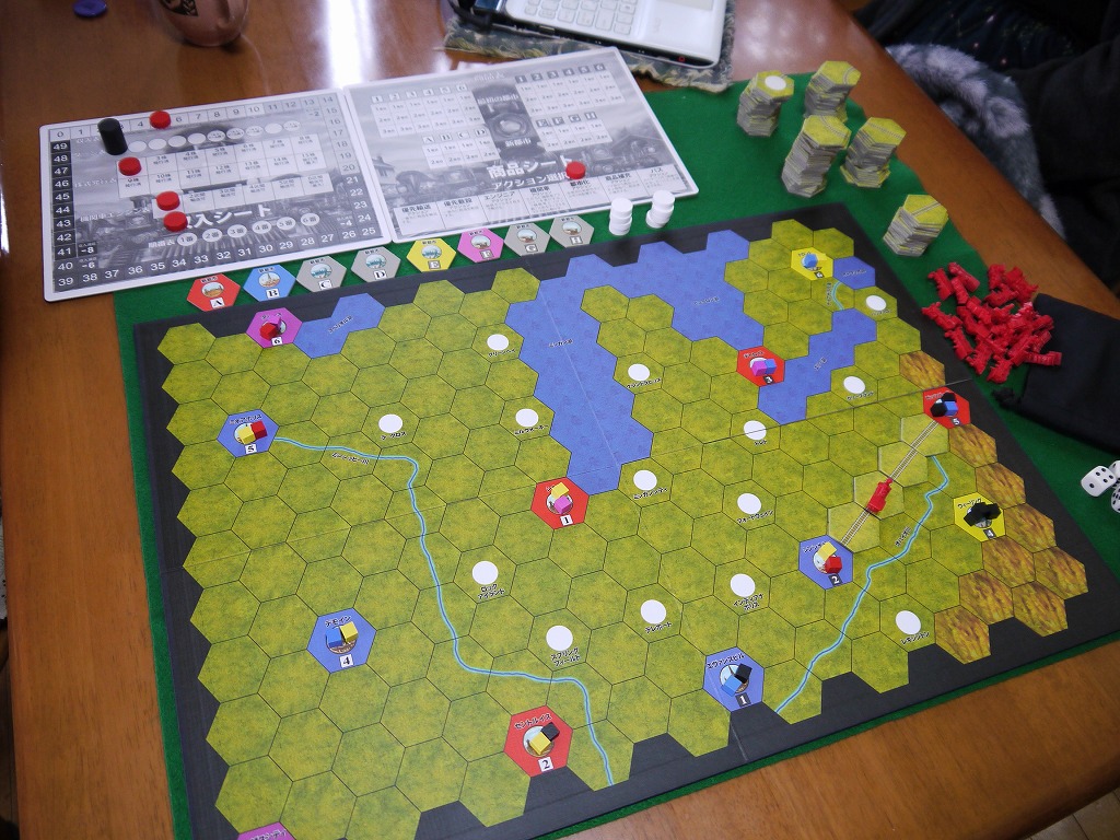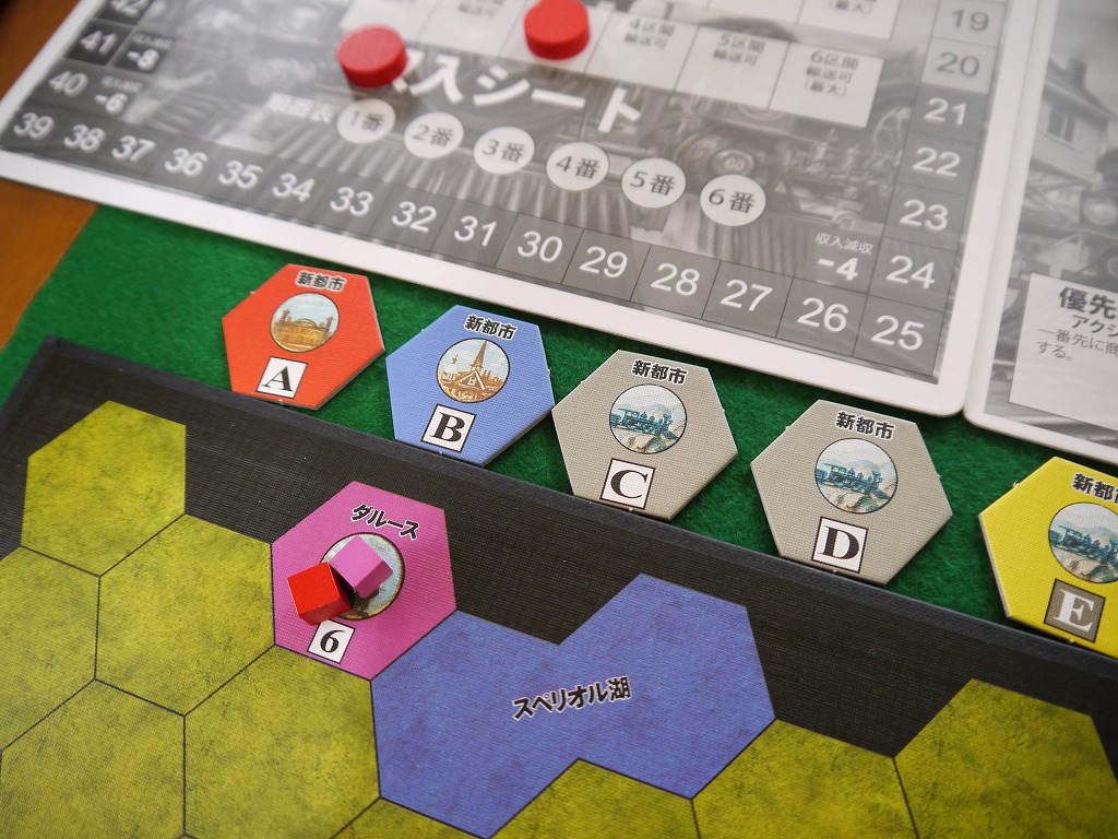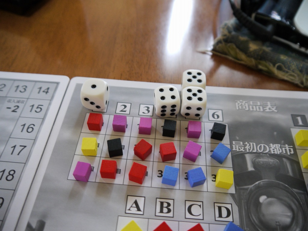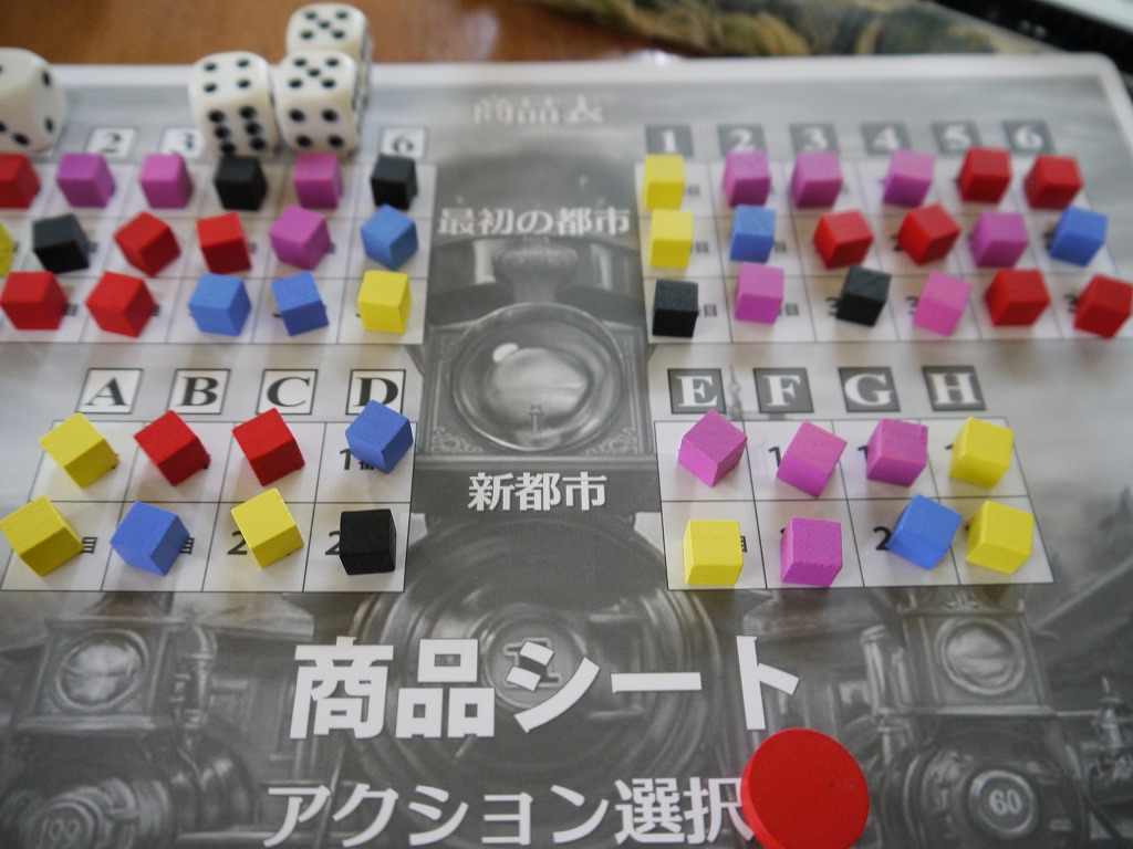 人数分のサイコロを振って、でた目を商品補充表の対応した場所に置く。んで、表の上から順番に商品を取り、対応した都市に置いていく。