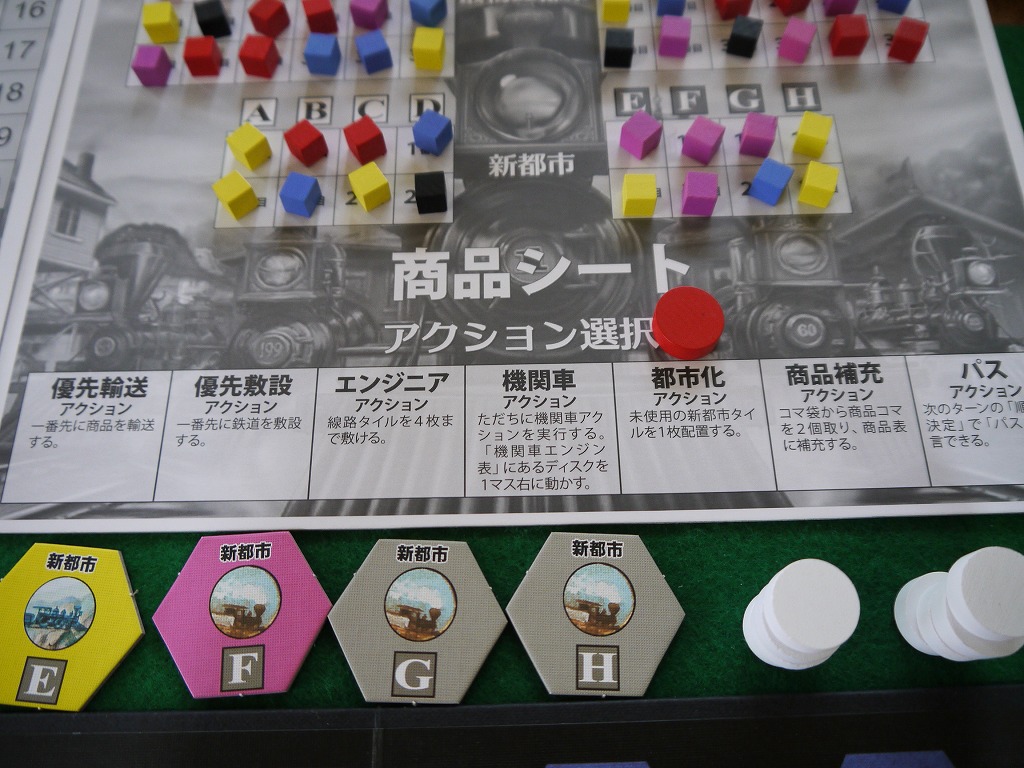 ちなみに都市化によって置かれたA~Hのタイルは、左側の表3-6、右側の表1-4に対応する。まだ登場してない都市には補充を行わない。