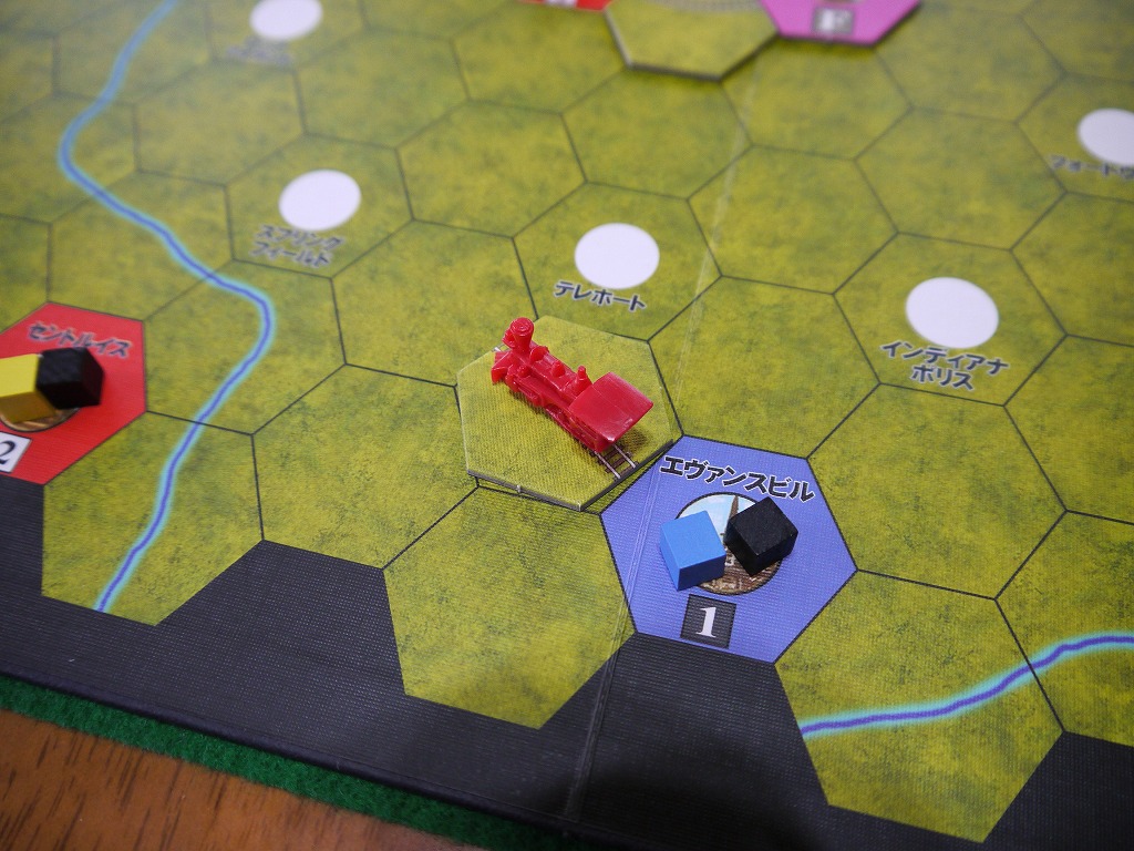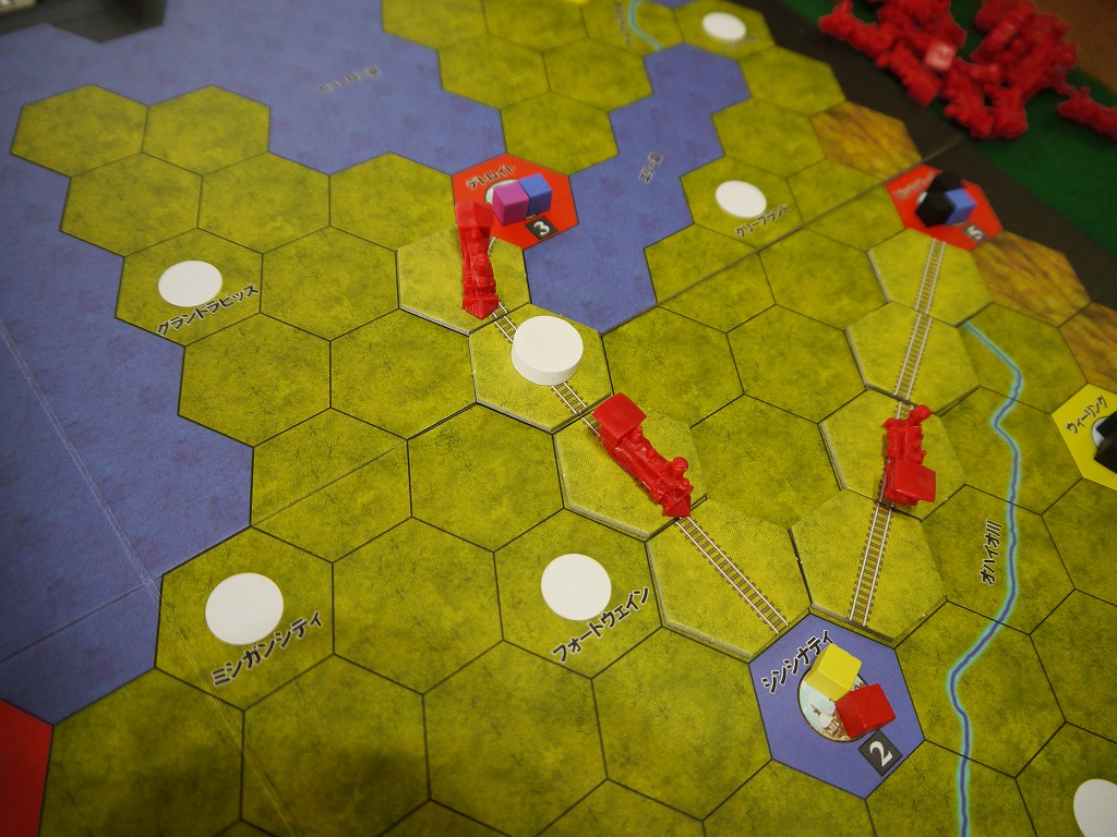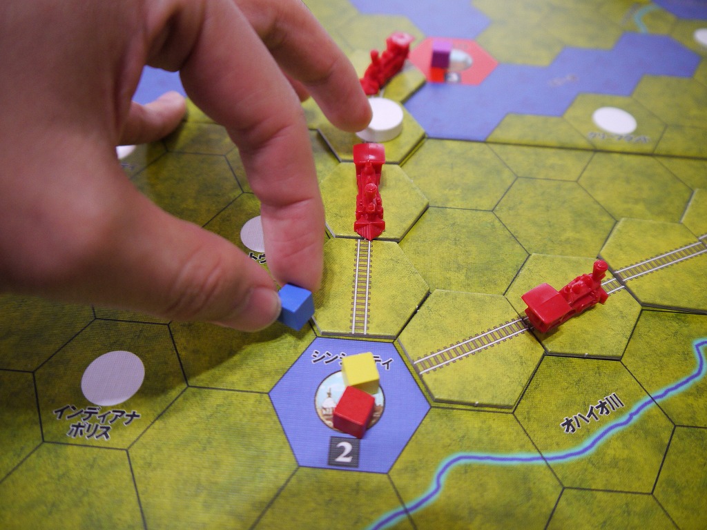 商品は各都市の上に載っているが、敷設された線路を使ってキューブと同じ色の都市まで運んでいく。運び終わったらそのキューブは取り除かれる。