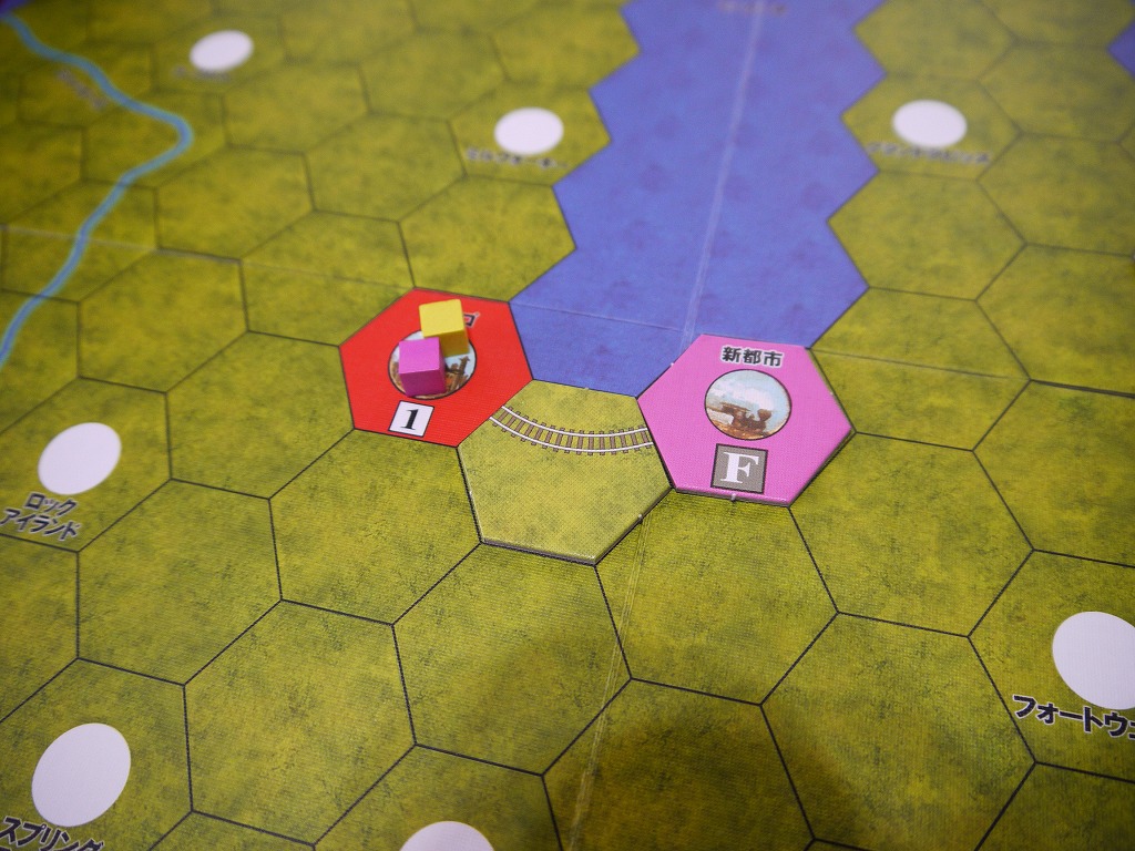 また、都市と都市を単純につなげば「1区間」なのだが、こんなふうに町や都市を間に挟むと、「2区間」となる。タイルの枚数は関係ない。
