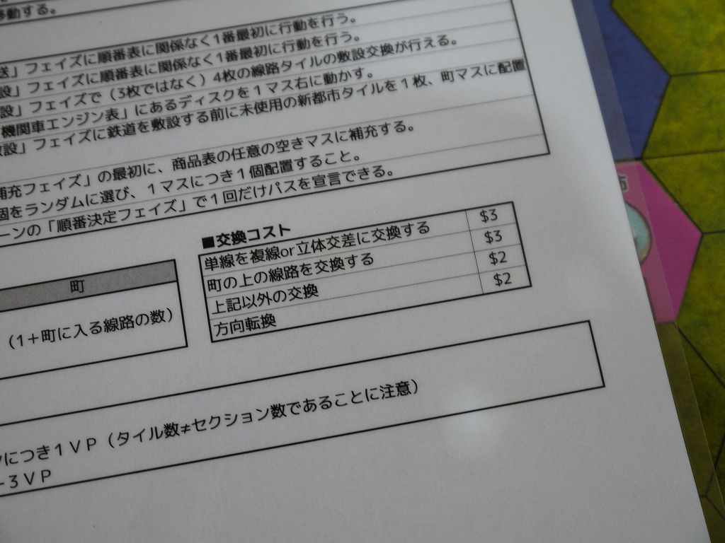 また、すでに配置したタイルの交換や、方向転換も出来る。他のプレイヤーが配置したタイルも交換できるが、この場合は既存の線路を潰さないようにタイルを交換しなくてはダメ。タイルはいろんな種類があるので目的に合うやつを探そう。ゲーム開始前に種類ごとに分けておくとスムーズ。