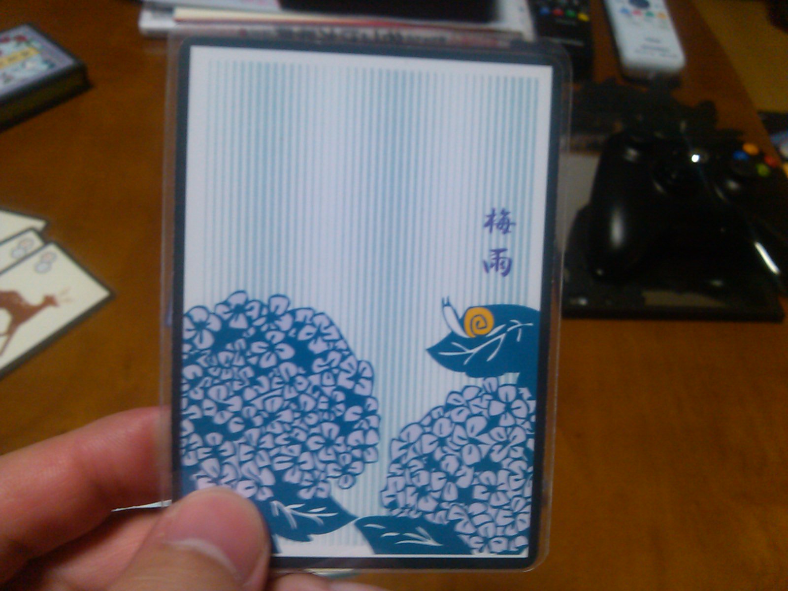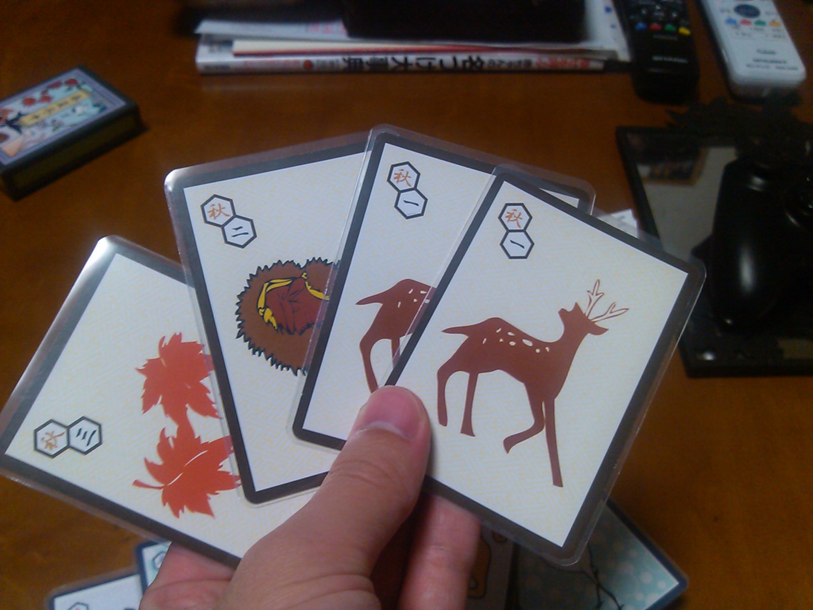 尚、手札の中には「梅雨」のカードが混じっている。これを持っている人は実質手札が4枚と、情報面で不利になるが、獲得点数が1点増えるというメリットが。