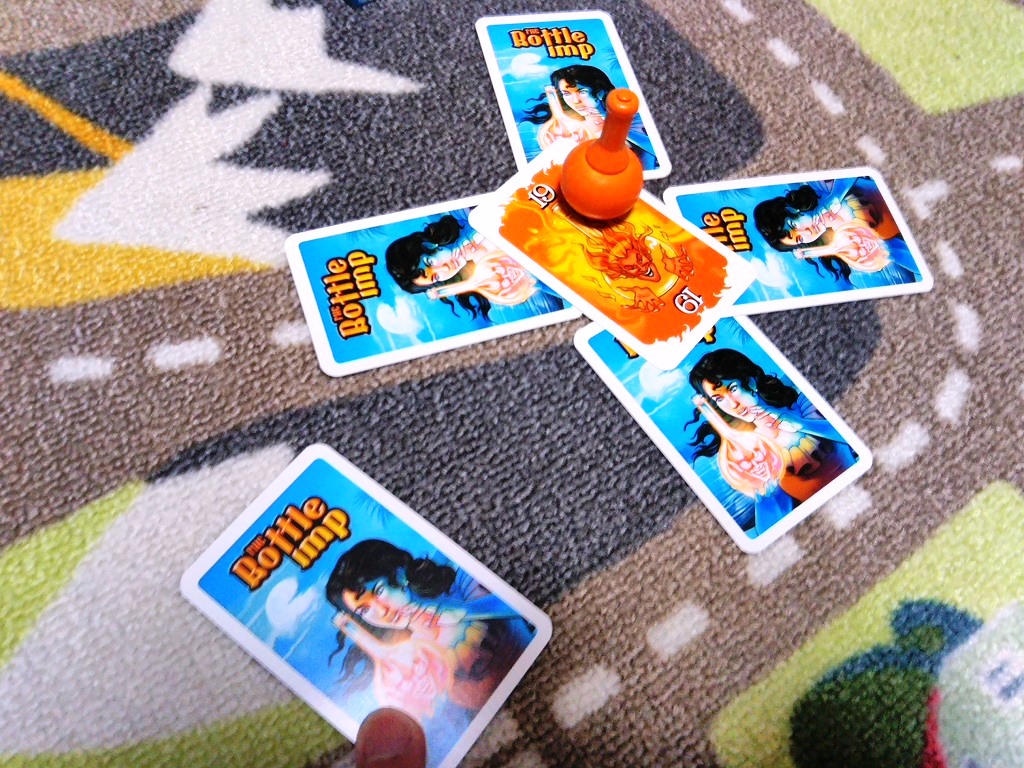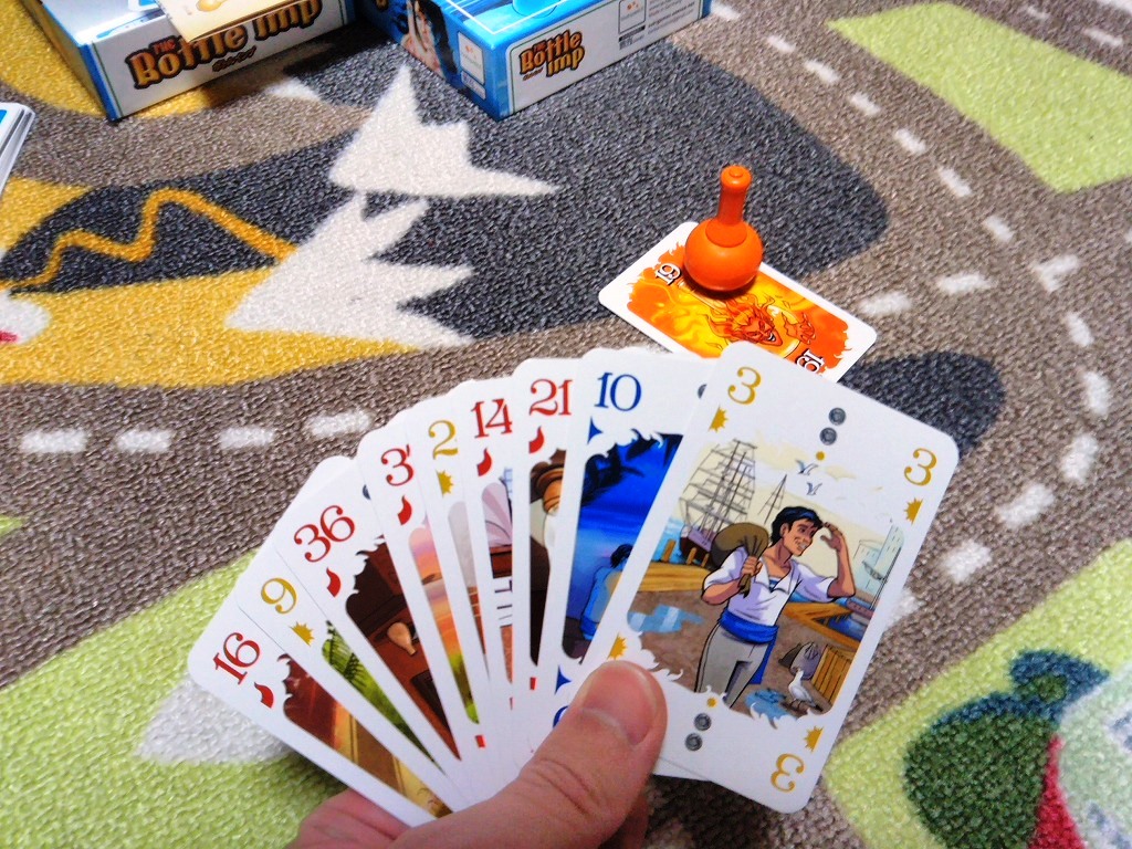 ゲームはマストフォローのトリックテイキング。ゲームルールが「びんの悪魔」つまりボトルインプのお話をとても良く表しています。