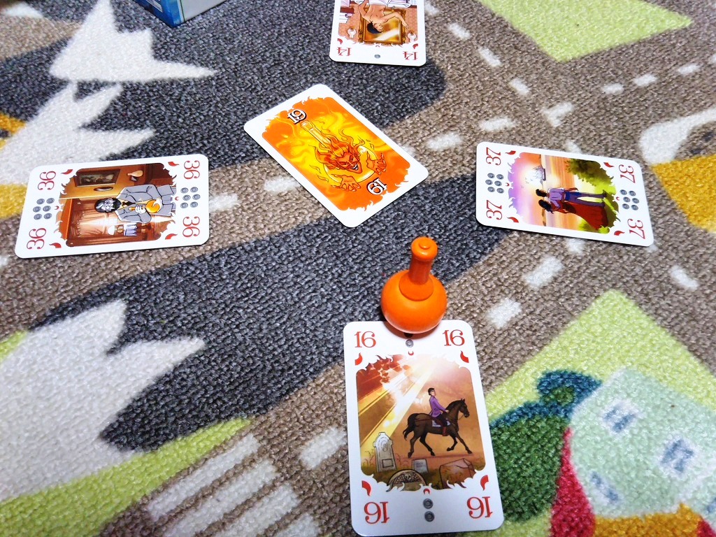 このとき、小びんの悪魔は、その勝ったカードに乗り移るんですね。この小瓶を最後まで持っていると、いくらカードを獲得しても0点です。しかも最初に伏せてゲームから除外されたカードの合計得点を、マイナス点として食らうというものすごい不幸に見舞われます。