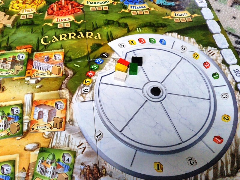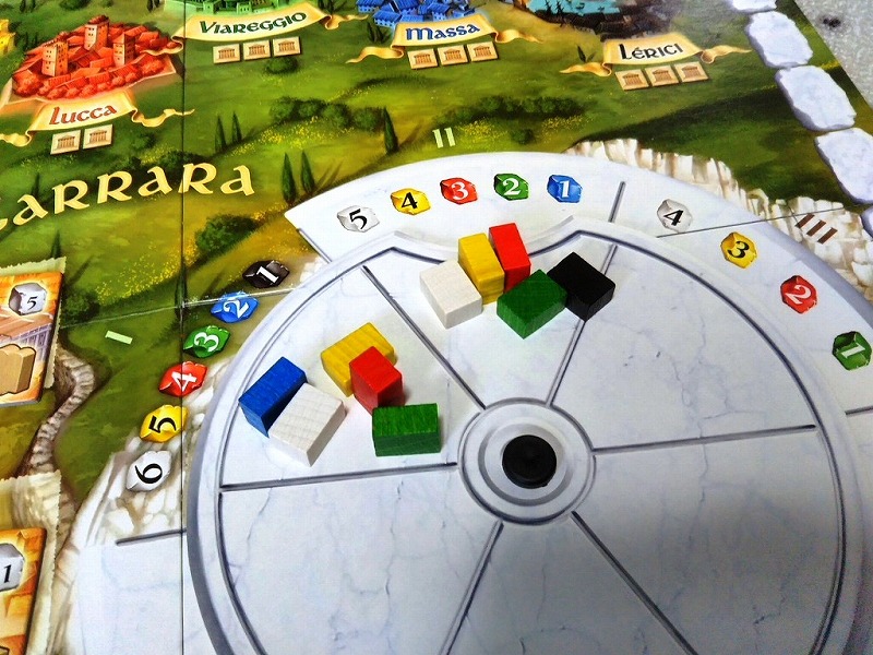 ここで、ディスク上の1スペースから石材を買えるのですが、値段は外周に書いてあります。つまり回転して先に進めば進むほど各石材の値段が安くなります。最終的には一番高い白石材もたったの1金に。また、わかりづらいのですが購入しようとしているスペースに書かれていない色の石材は無料で買えます。
