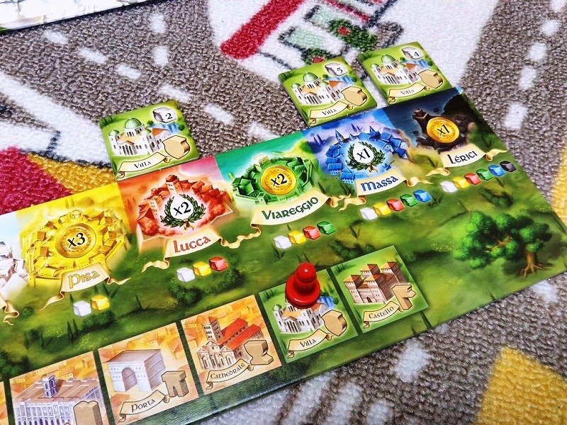メインボード上から選んで建物を建てます。このとき、個人ボードに書かれている6都市のどこかに建てるのですが