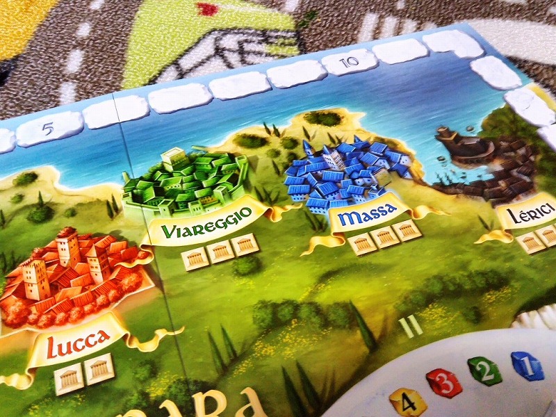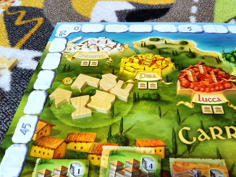 つまり建物に払った石材数×倍率 のお金か勝利点が入るわけです。左の都市ほど倍率が高い。