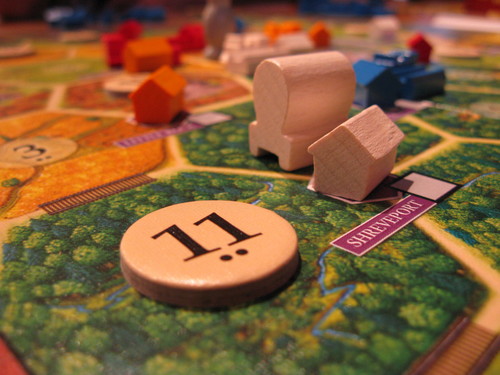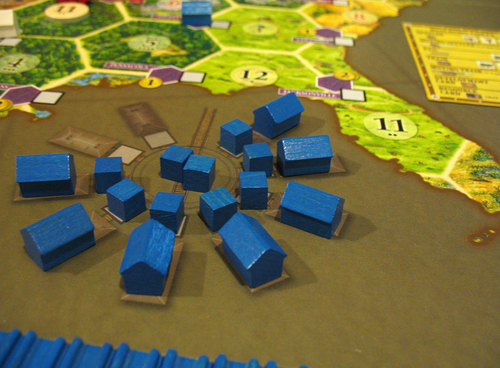 ダイスを振って、自分の都市に隣接した地域から資源が産出し、それを交渉で交換しながら新たな土地に開拓地を建てていきます。