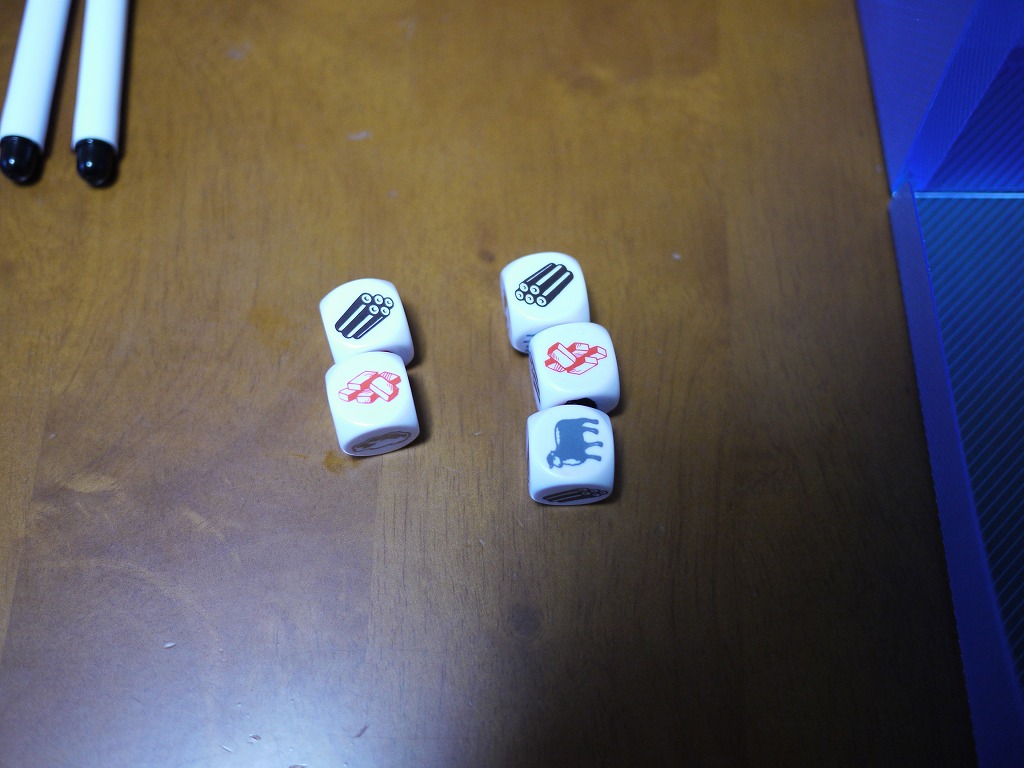 今回はソロプレイなので、とりあえず転がしてみる。付属のダイスカップはちょっと小さくて使いづらいので、ダイスタワーを使用。