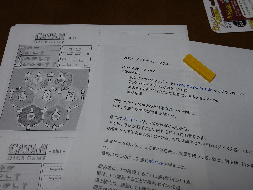 なので原作者のクラウス・トイバー自らが考えたヴァリアントルール「カタン:ダイスゲーム プラス」がある。2人以上でプレイする場合はこちらがおすすめ。本家カタン同様、ロンゲストロードとラージェストアーミーの奪い合いがあり、より本家ルールに近づいている。