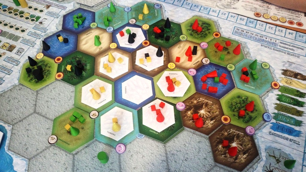 これを生かして、ぎりぎりの個体数で競り勝ったり、誰も生き残れないツンドラタイルにキューブを残してサバイバルし続ける、といった戦略が可能になります。