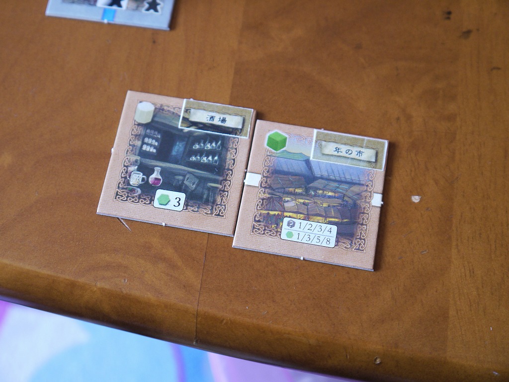 この中では酒場が強そうに思います。一度ウイスキーを使用して配置してしまえば、後は発動するたびに勝利点が手に入ります。まあ酒場の周りにおけるタイルはせいぜい5-6枚なので、限界はあるのですが。