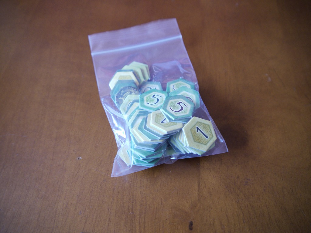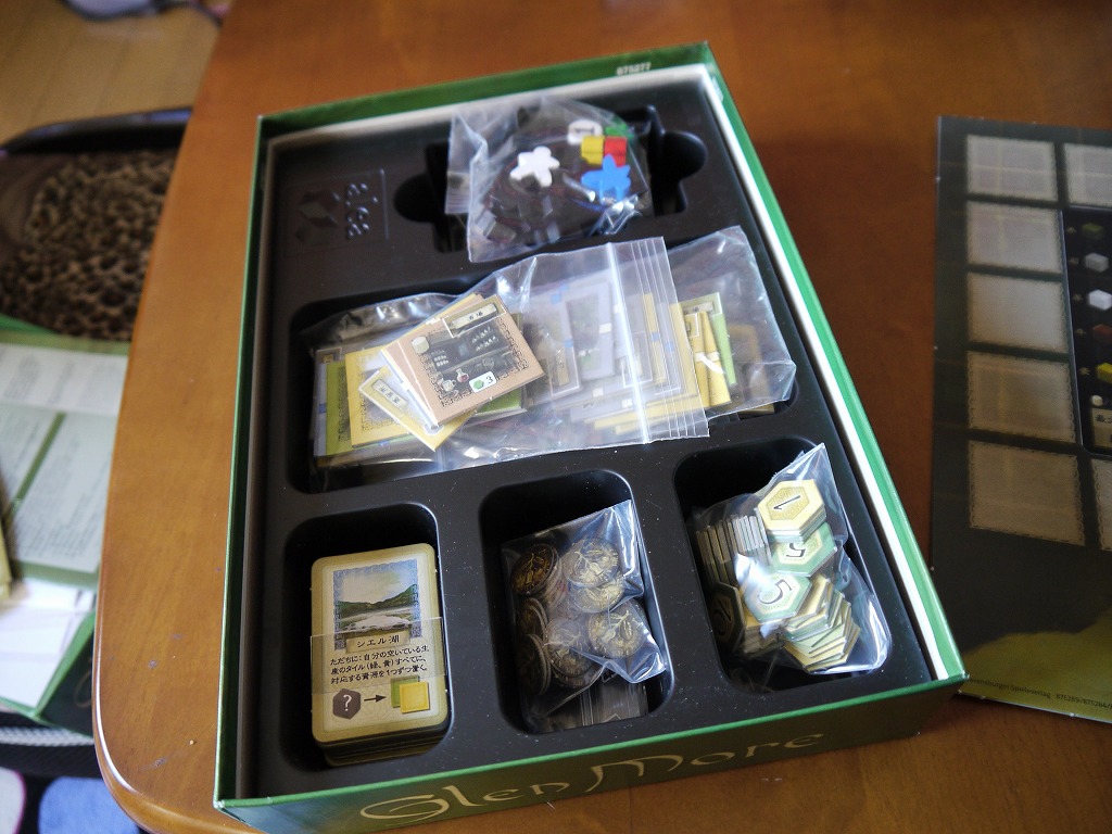 フタを開けると豪華なコンポーネント類が。木製のミープル、お金や勝利点トークンが沢山。若干タイルの薄さが気になるぐらいで、見た目は大満足。