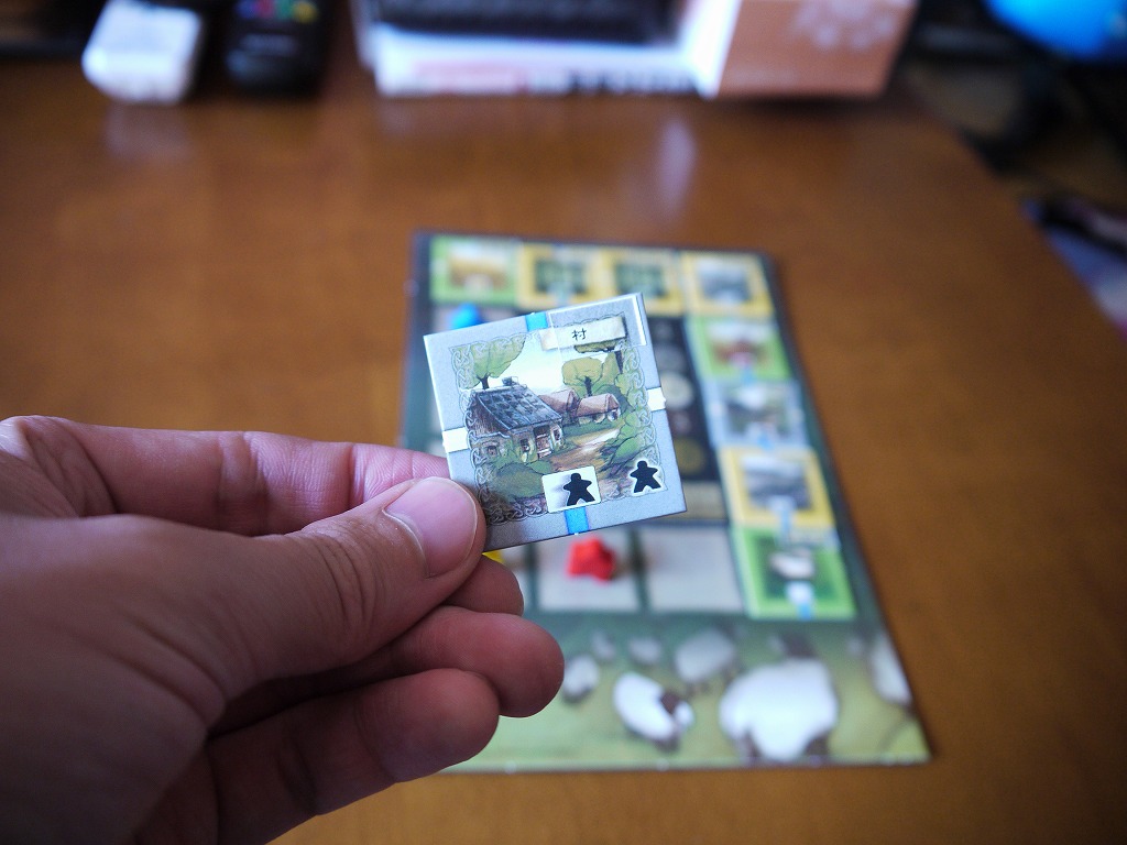 (この写真では忘れていますが、本当は置いた村タイルの右上「草原」タイルの上に、羊を表す白いキューブを一個載せます。置いたタイルの周りが「発動」するので。)