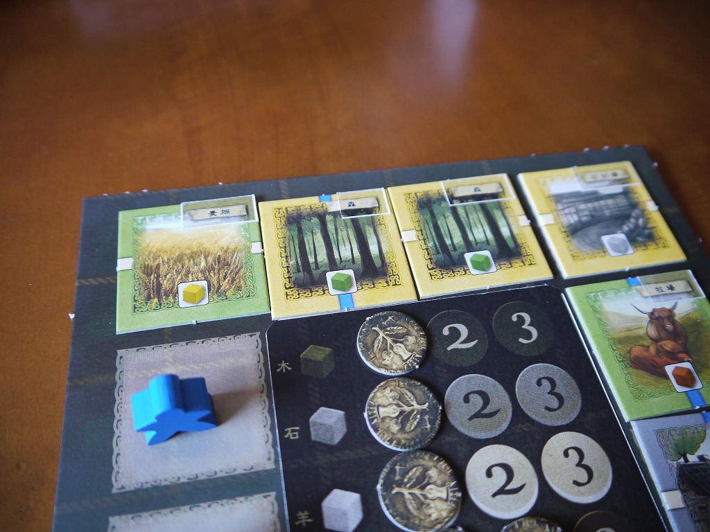 ※産出した資源はタイルの上に載せておくのですが、最大で3つまでしか載せられません。溢れそうだったら共通の市場に売ったり、年の市で使ったりしてやりくりします。