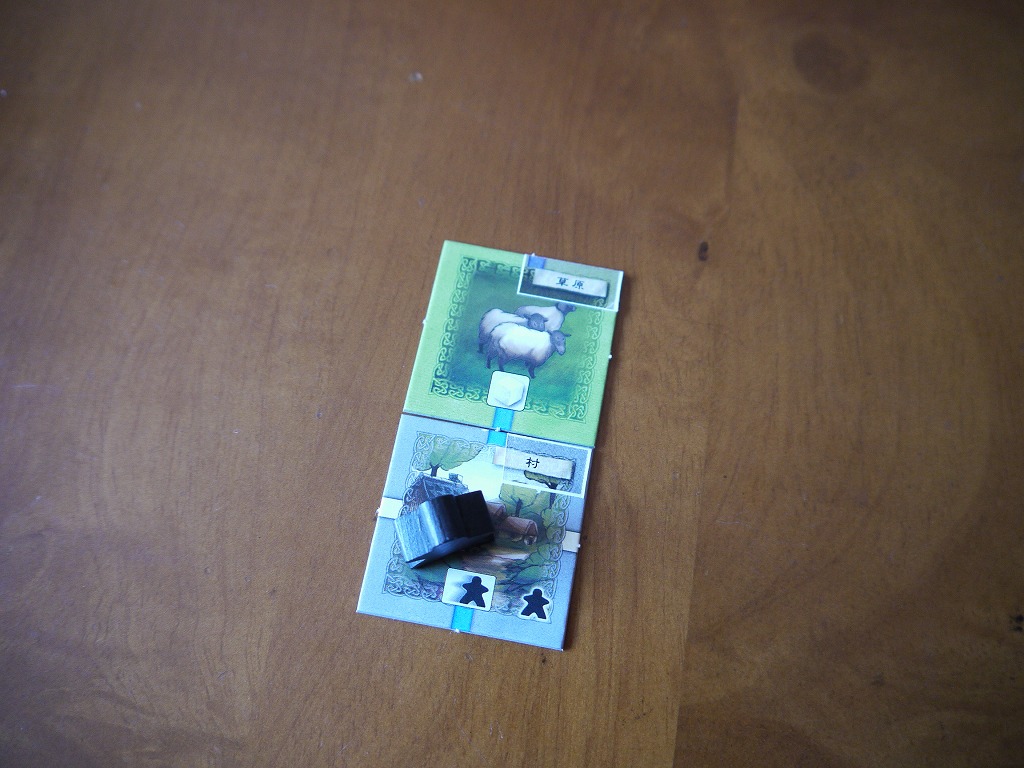 ちょっと説明が難しいのですが、まずこのタイルを配置すると右下の効果「黒ミープルを増やす」が発動し、タイルの上にミープルを載せます。