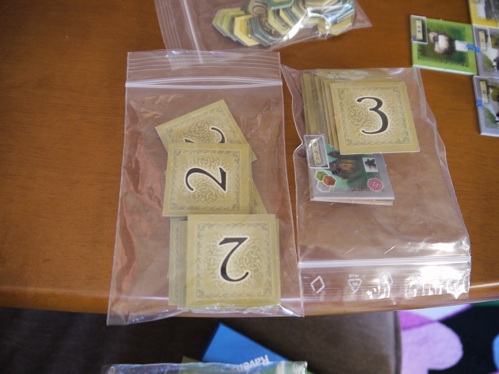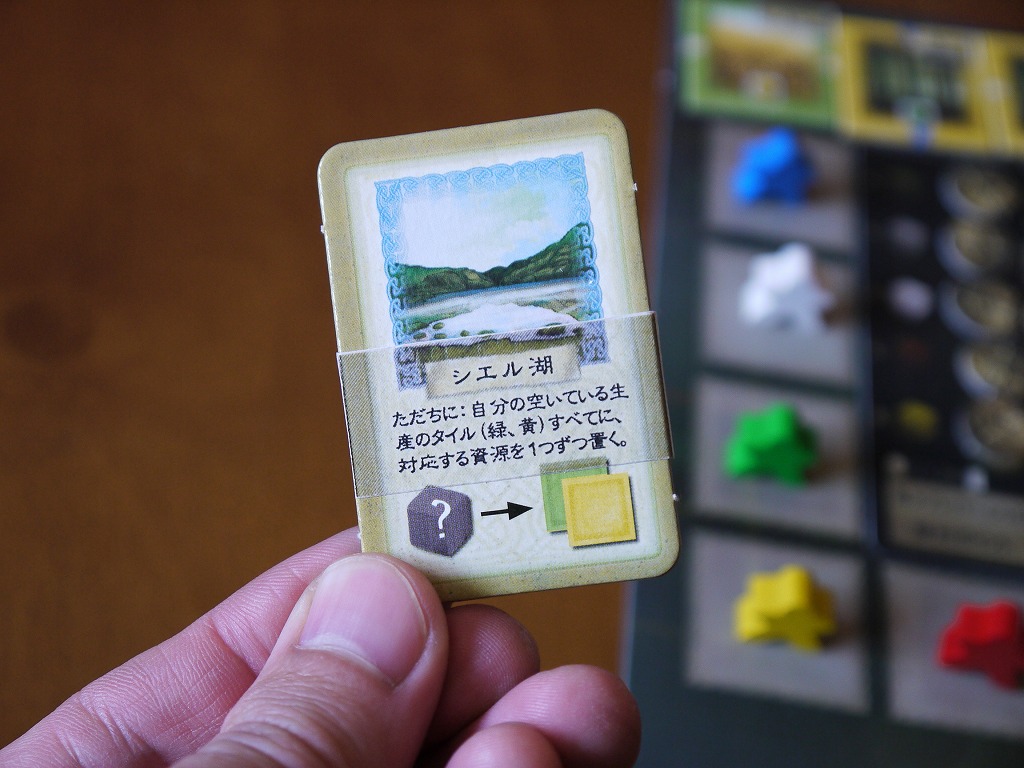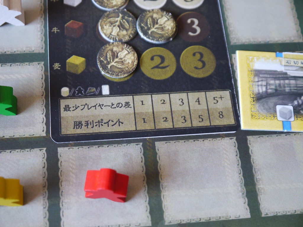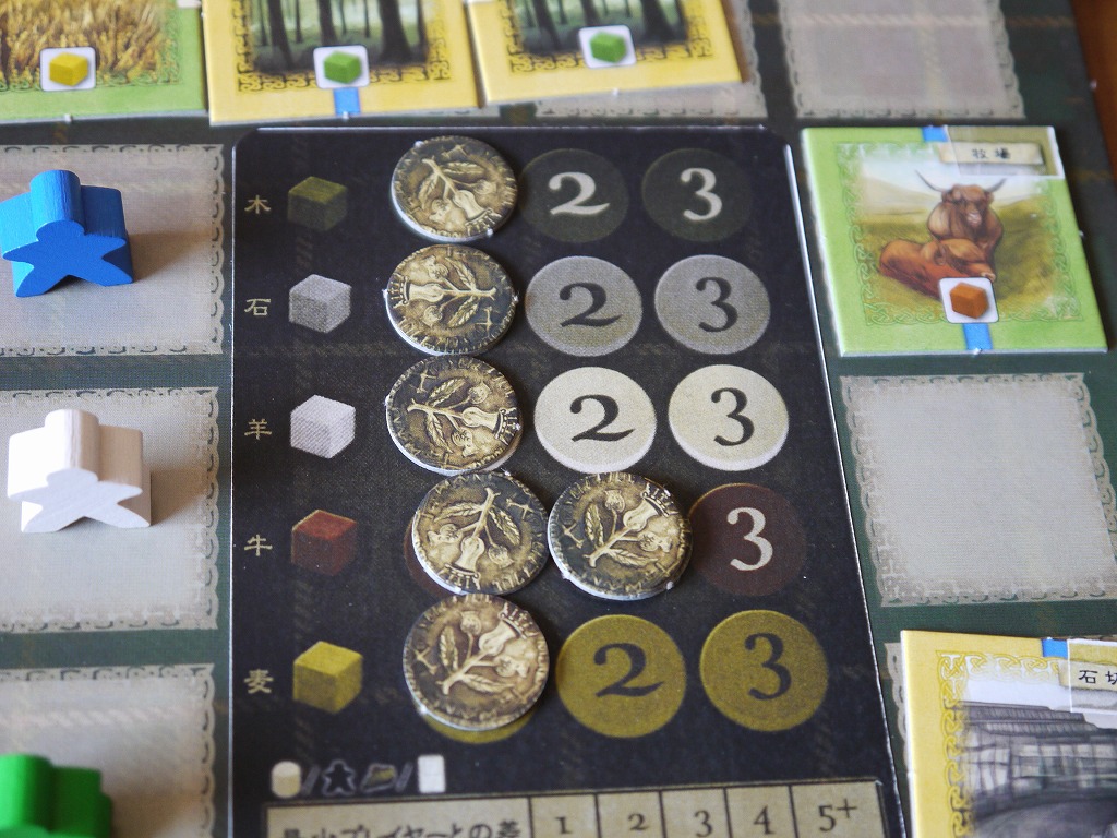 私がプレイした時は終盤、皆が資源タイルを飛ばして一気にボードを跳ねまわったので、「3」のタイルが早々に切れました。「あれ?、まだやりたいことあったのに・・・」と思っている間にゲーム終了。