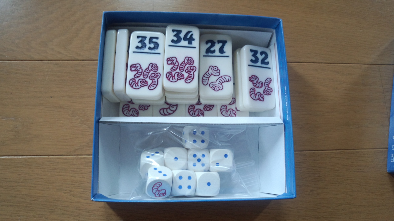 コンポーネントは8つの木製サイコロとズシッと重量感のあるタイル。このコンポーネントは素晴らしい。水濡れに非常に強いのだ。