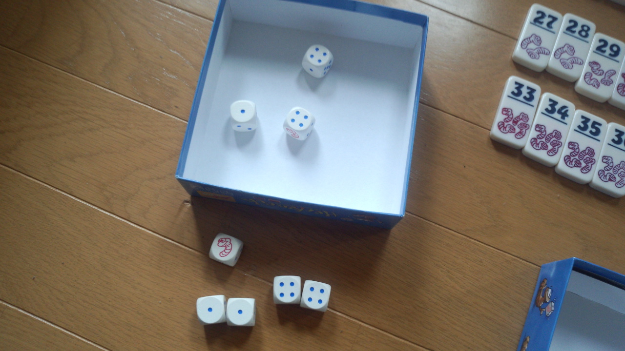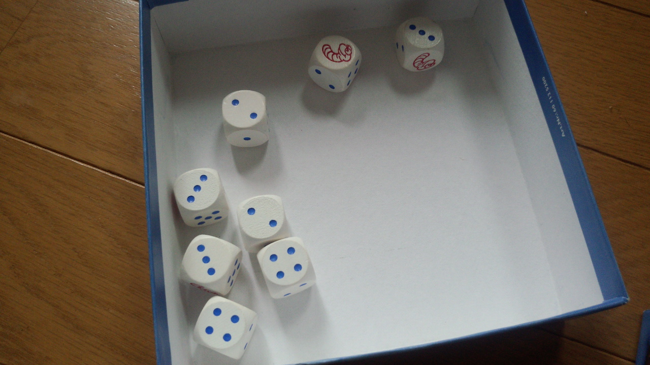 タイルには21~36の数字と虫が数匹が書いてある。8つのサイコロの目の合計で、この数字以上を確定させればいいのだ。