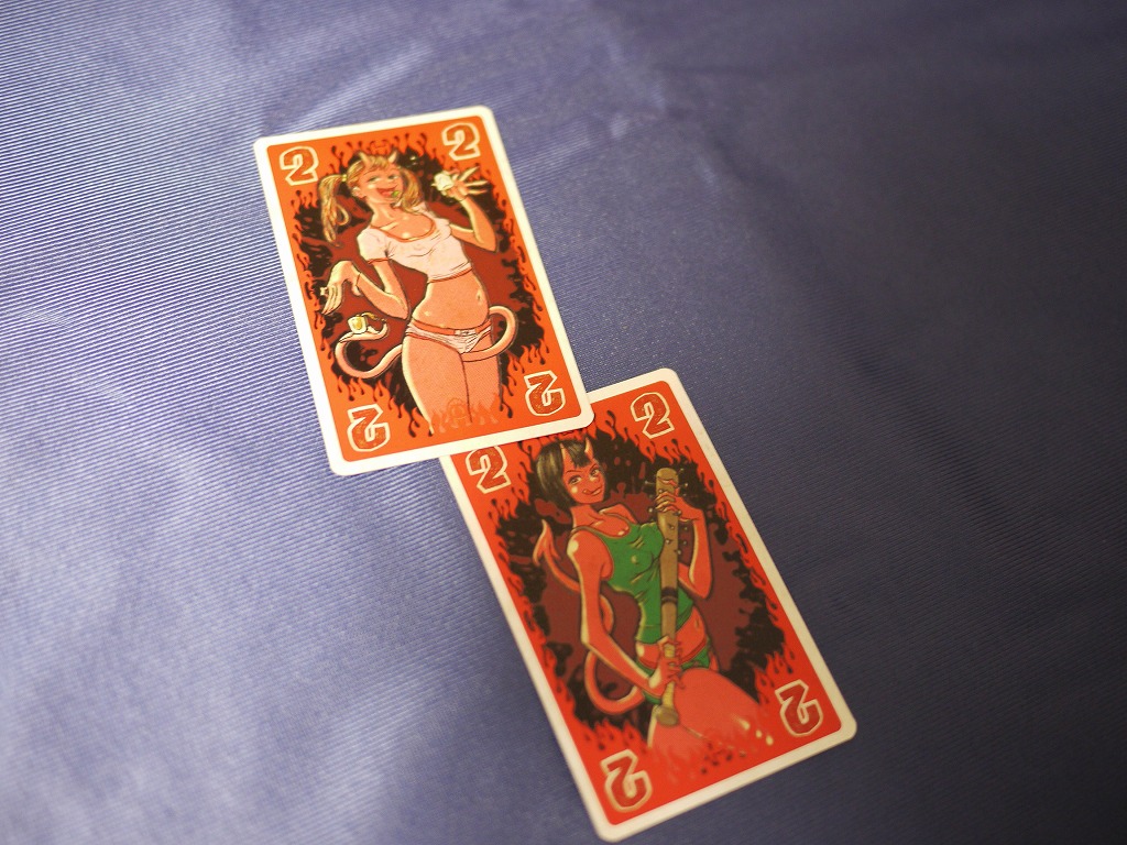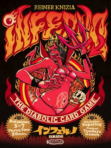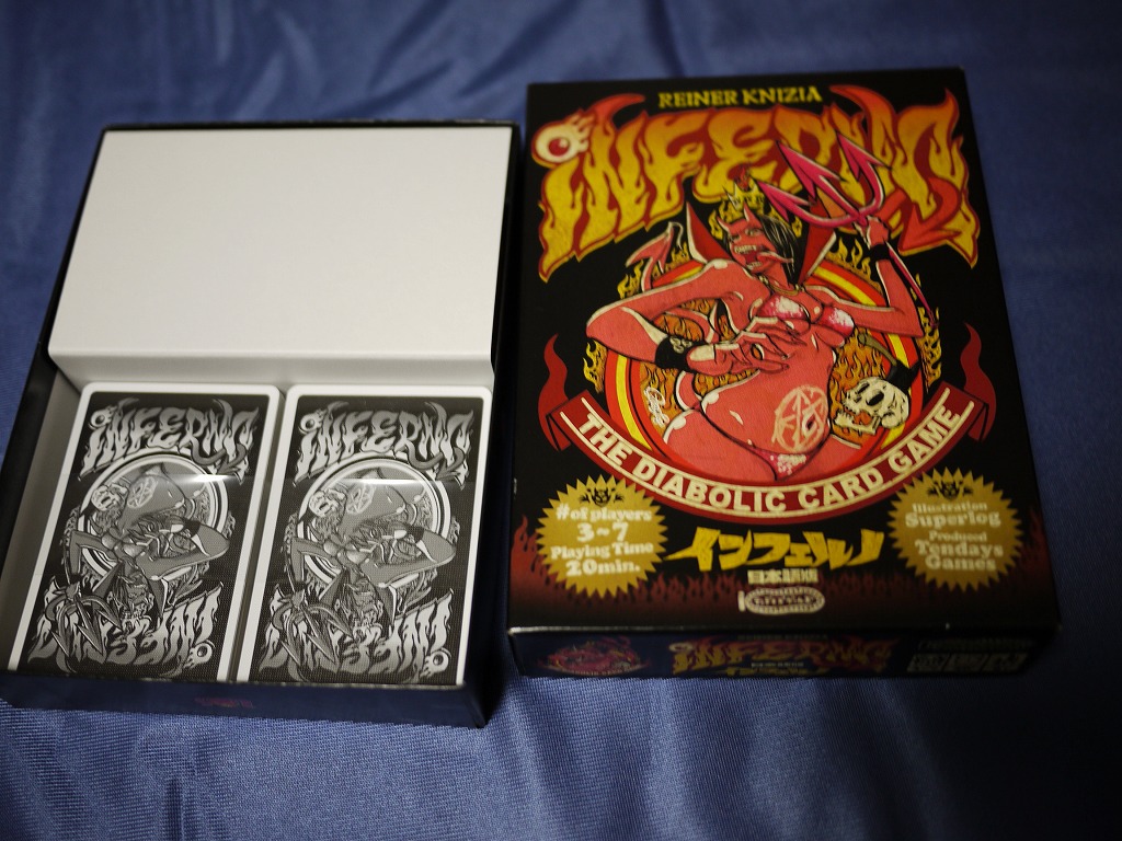 つい先日、日本語版でのリメイクが出たお手軽カードゲーム「インフェルノ」。元々はなんかゆるゆるな悪魔が描かれた小箱ゲームだったのが、テンデイズゲームズのリメイクによってダンディなおっさん悪魔とエロいねーちゃん悪魔が描かれたロックなイラストに。