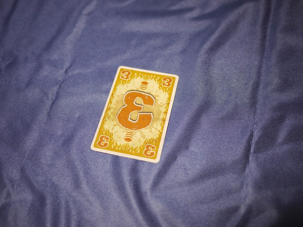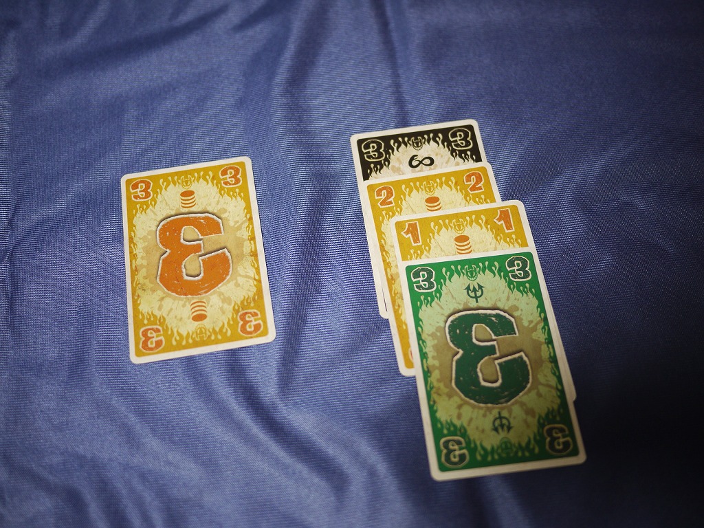 手札マネージメントの要素もあって、残りの手札が少ない時にスートと数字をバラバラに残してしまうと、自分に手番が回ってくるたびに引き取る展開になり、苦しいです。
