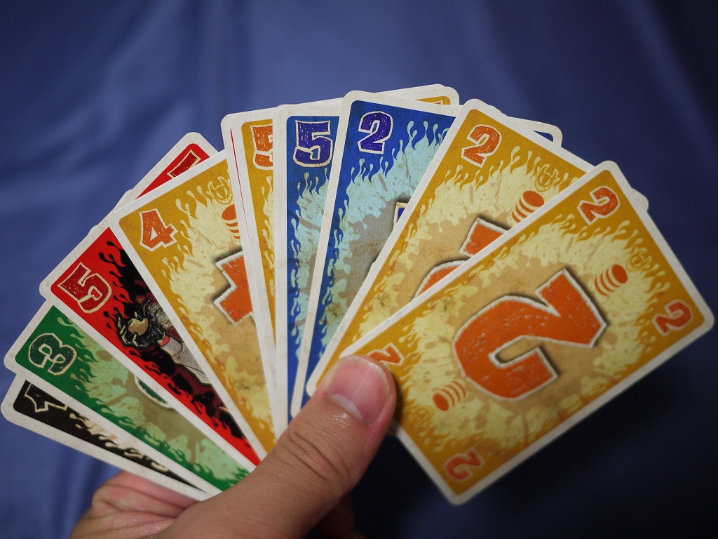 地獄の業火に怯えながら、プレイヤーたちはカードを出し続けます。各色のカードはそれぞれが火傷を負うぐらい熱いのですが、赤いカードは灼熱のカード。特に痛手が大きいのです。