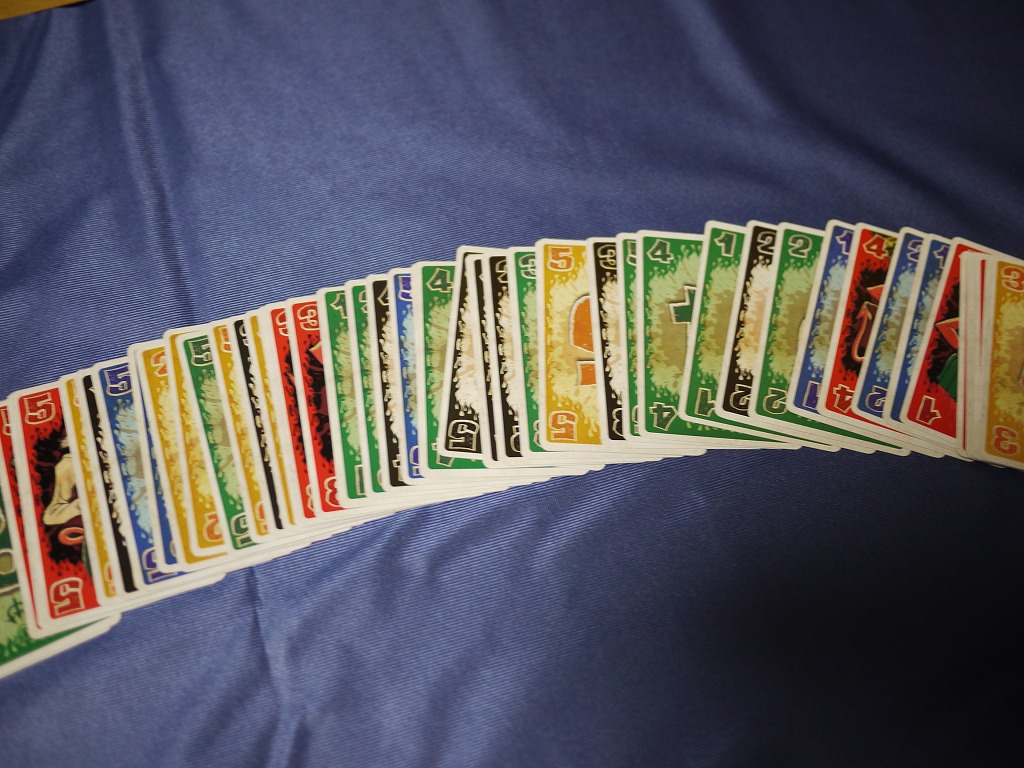 引き取ったカードは一枚につき-1点。 赤いカードだけは書いてある数字がそのままマイナス点なので、赤の4や5を引き取ってしまうと悲惨だ。