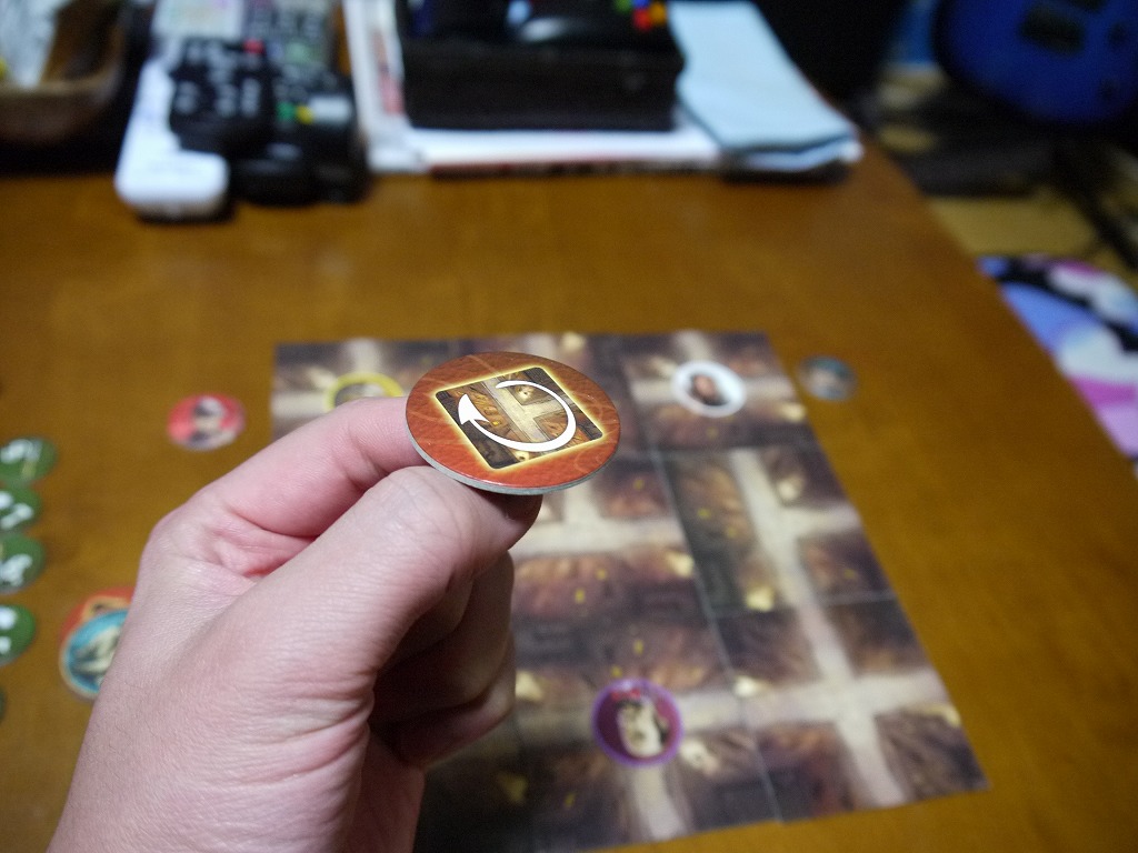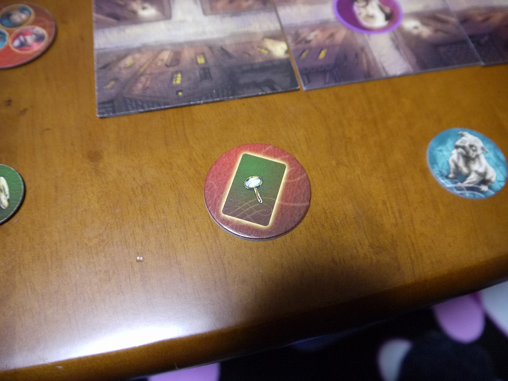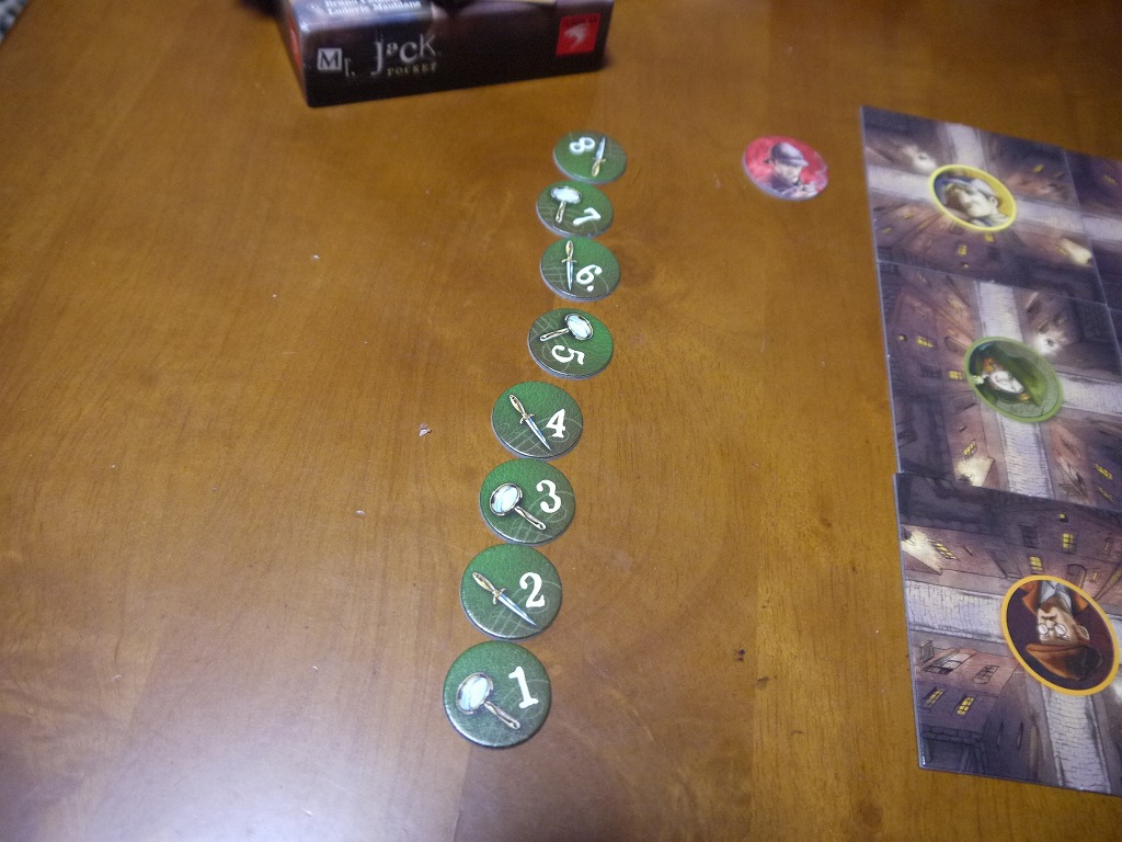 ラウンドを表すチップには先手をどちらが取るか記載されています。虫眼鏡はホームズ。ナイフはジャックから。
