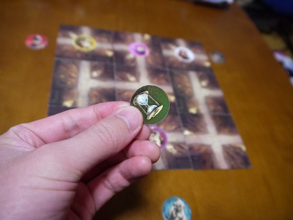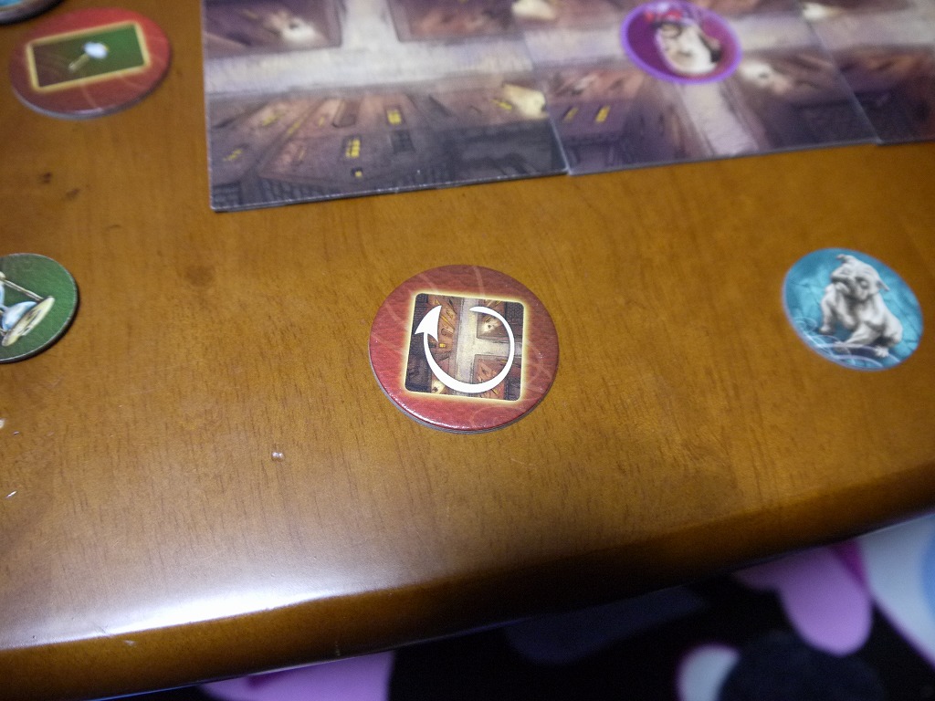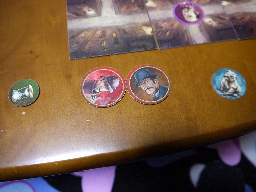 そして容疑者タイルを引けるというアクションがあります。ホームズがこれを引くと容疑者を絞り込めるのですが、ジャックが引くと書いてある砂時計をカウントすることができます。ラウンドチップと合わせて6つ集めれば勝利条件達成!