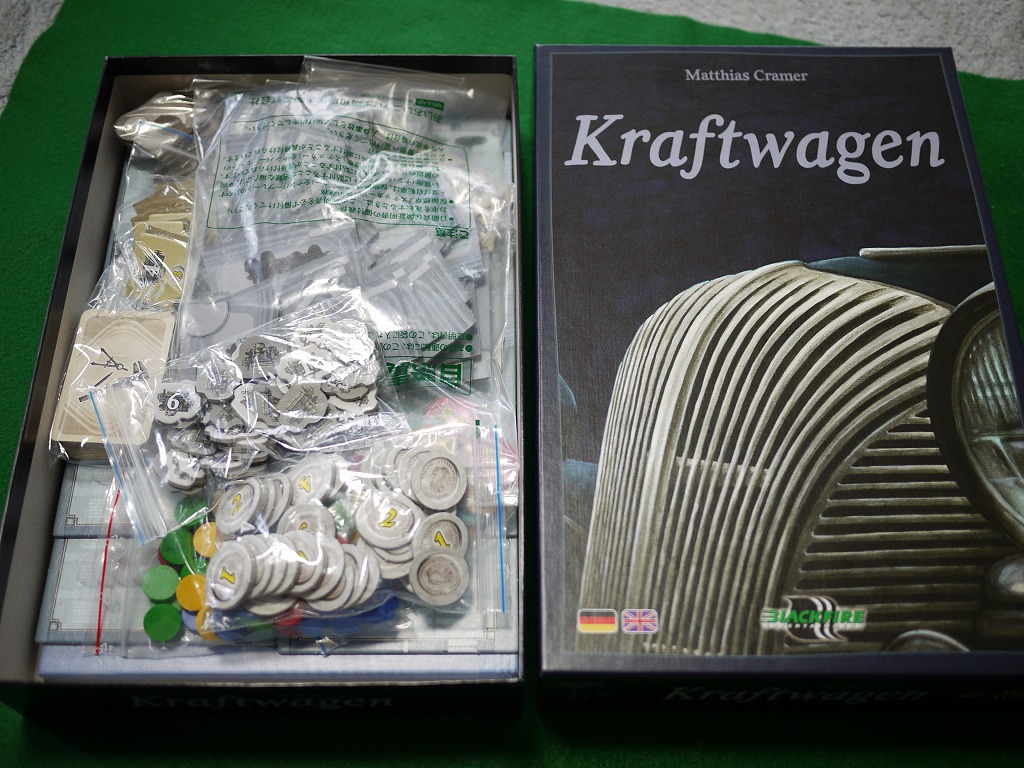 「グレンモア」で華々しいデビューを飾ったマティアス・クラマーの2015年作品。ランカスター・ヘルベチアと未プレイの作品があるが、このクラフトワーゲンはテーマが好みなので速攻入手してプレイ。8,100円とユーロ高を反映してちょっとお高めではあるものの・・・。クラシックカーテーマの渋いゲーム好きだし・・・。