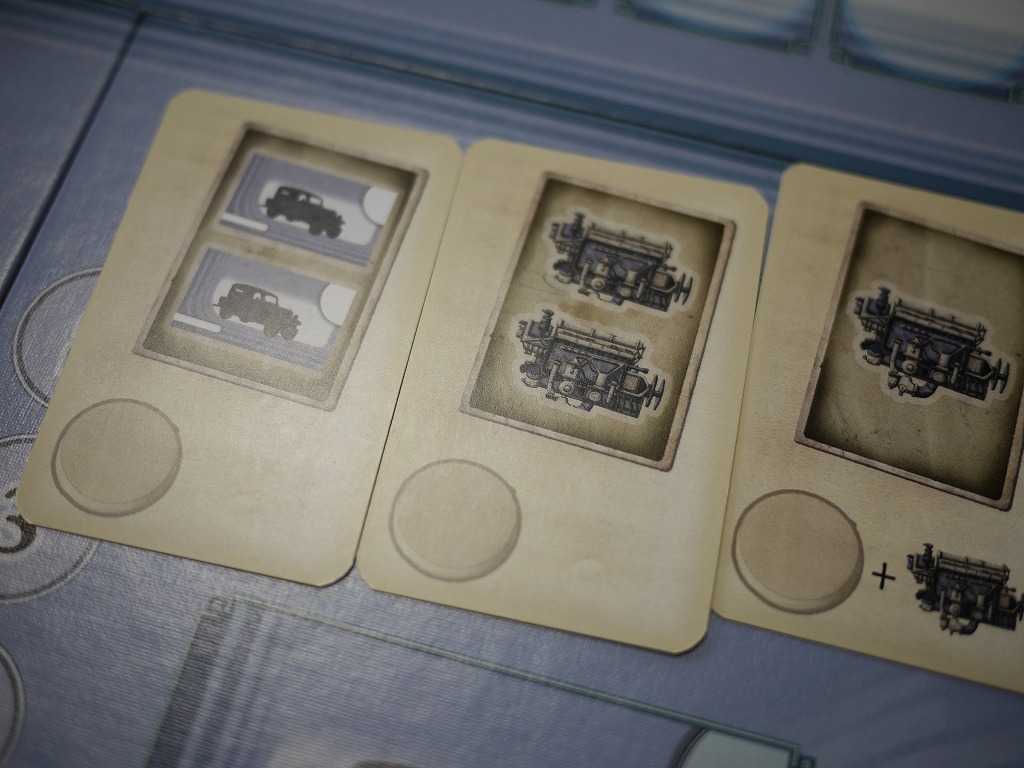 個人ボードは4つの倉庫に区切られていて、ひとつはレースカー専用のスペース。ここには最初からレベル1のエンジンを置いた状態で始まります。(先述のスタートタイルによって違います)