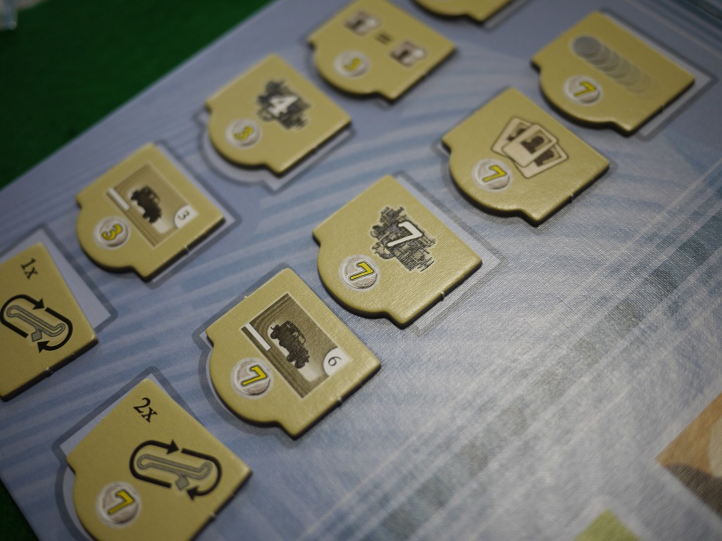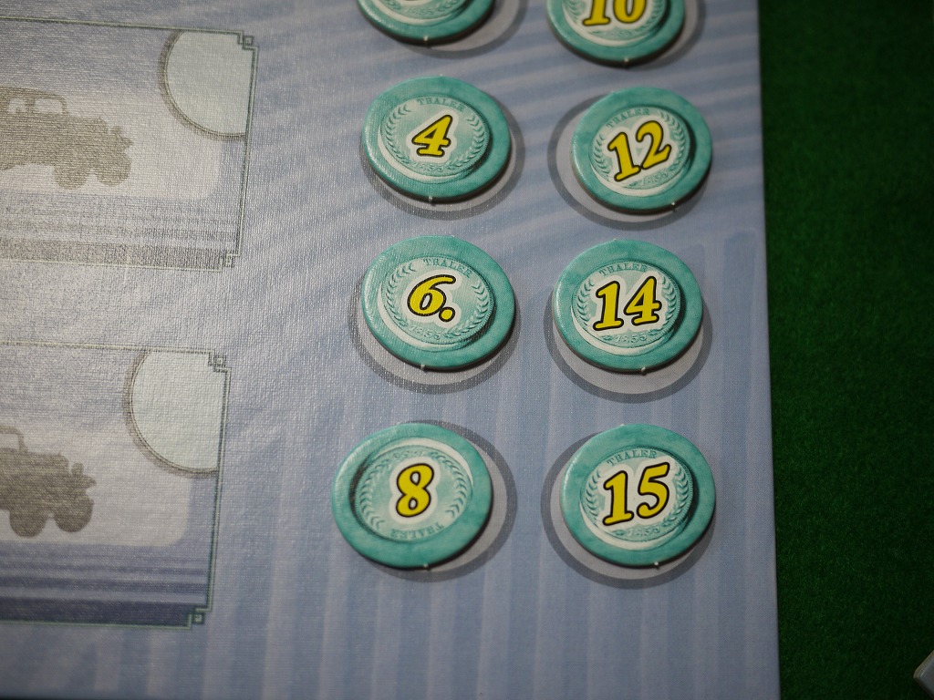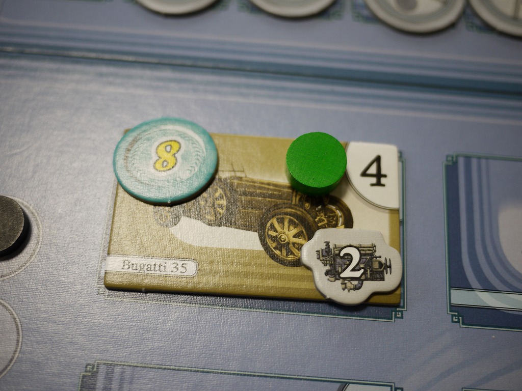 ここで車の値段も決めます。ラウンドごとに価格が変わるこちらのチップから1枚を選び、車と共に配置します。