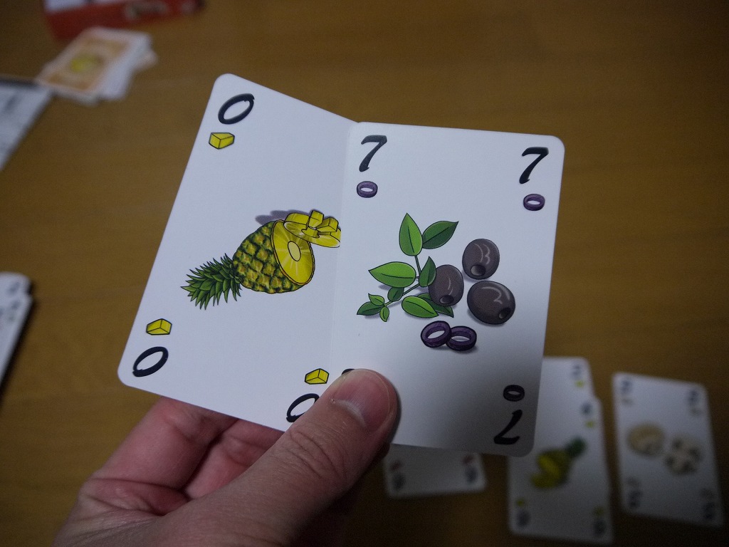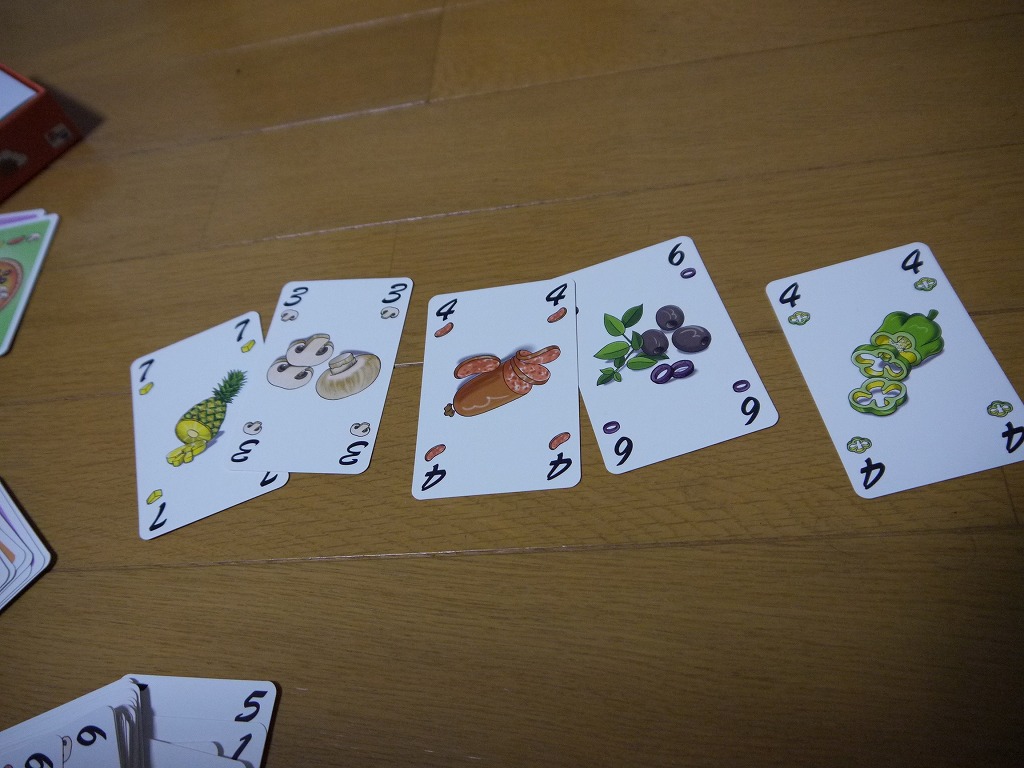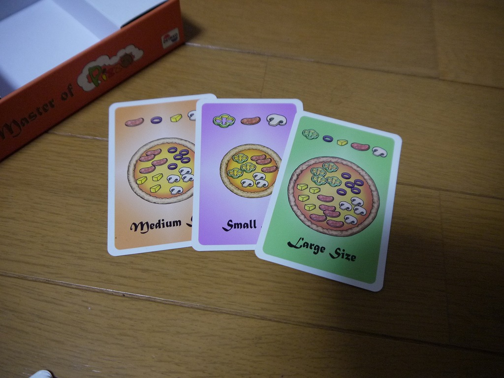 カードは5種類のスート(具材)があり、それぞれ0-7の数字が書いてある。合計40枚。Lサイズピザは5種類全て集める必要があるので、全員カードは一緒。SサイズとMサイズのレシピカードは、各々必要な材料が異なる。一応非公開。