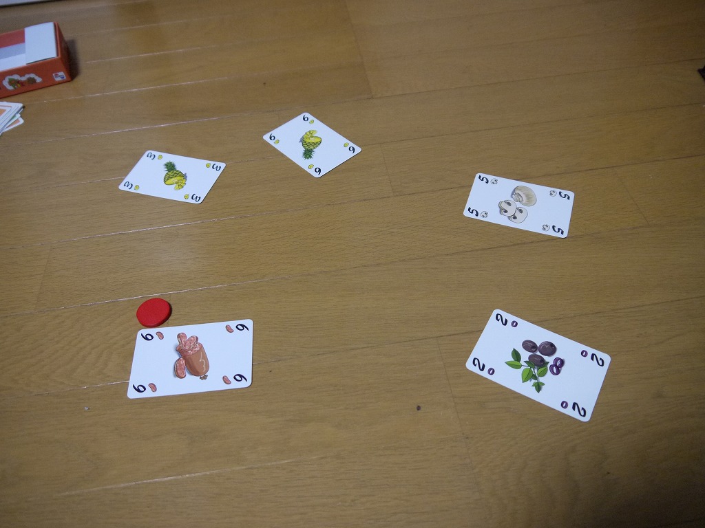 ※なお、リードプレイヤーはトリックを取ったプレイヤーではなく、「同じ具材をプレイしたプレイヤーのうち、一番大きい数字を出した人」もしくは「具材がかぶらなかったら、再び同じ人がリードプレイヤー」となる。こうしないと2-4ぐらいの数がほとんど意味を成さないので、これは良いルールだと思う。先出しが価値としたので、リードプレイヤーになるのは非常に重要だ。