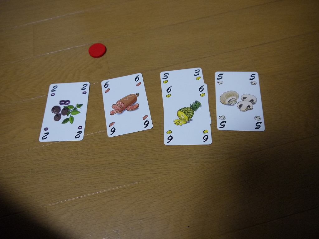 ただしトリックを取得した際に、カード獲得順はリードプレイヤーから時計回りだ。同じ具材は重ねて置かれ、