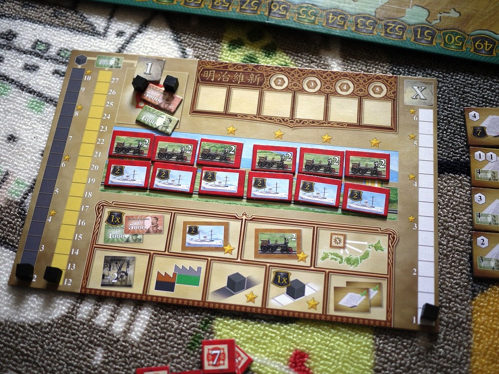 更にこのゲームには大き目の個人ボードが。列車と船のタイルをならべ、知識・石炭・収入の各トラックに黒キューブを置きます。