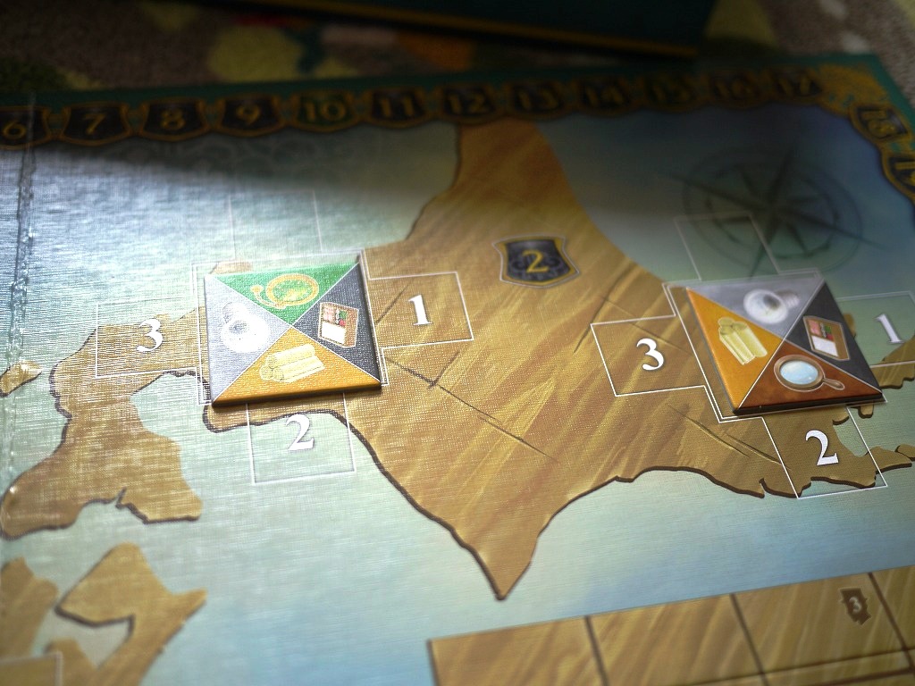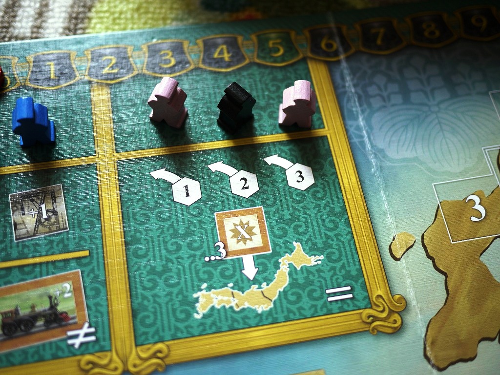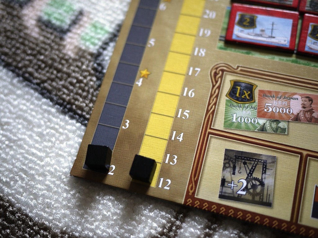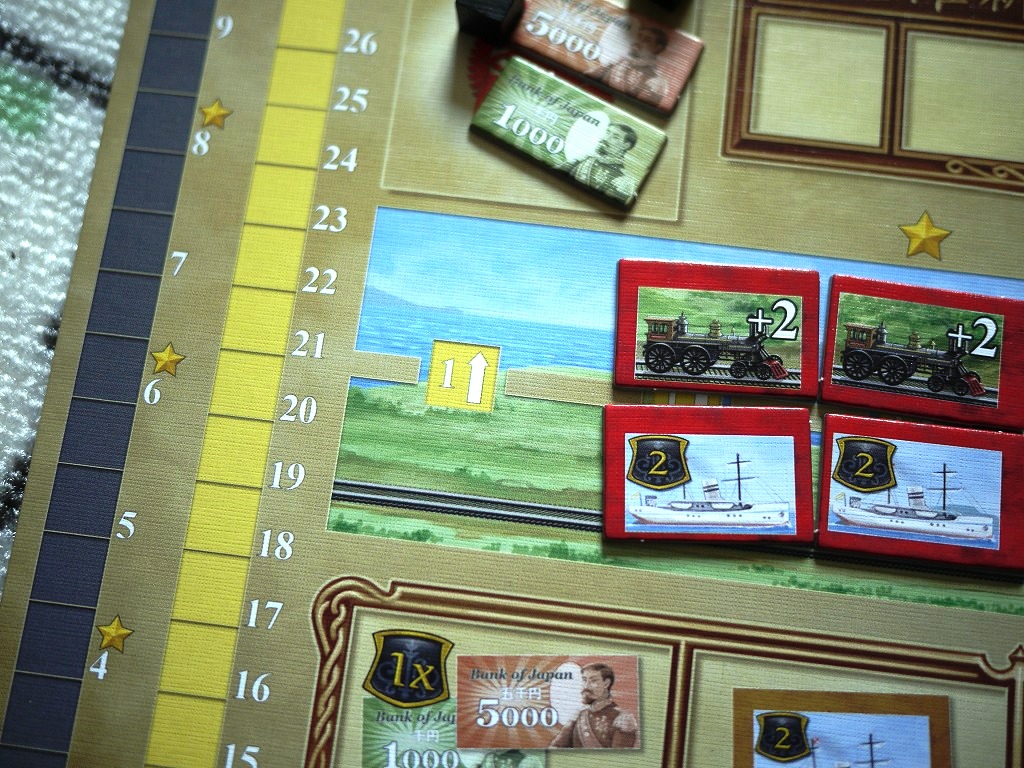 ここで気を付けたいのが、最初からボードに書かれている数字。これは「外国資本」で、この数字の合計が順位争いに絡んできます。タイルが置かれていくとだんだん外国資本は駆逐されていきます。
