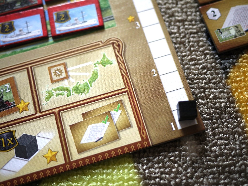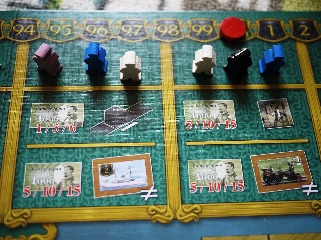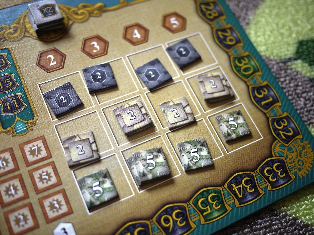 受け取ったら、倍率の面を上にして個人ボード下部のエリアに置きます。何やらいろいろ書いてありますが、最終決算に影響します。