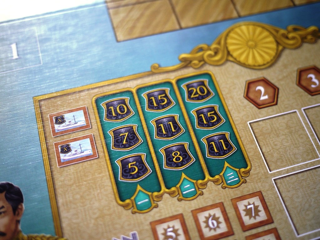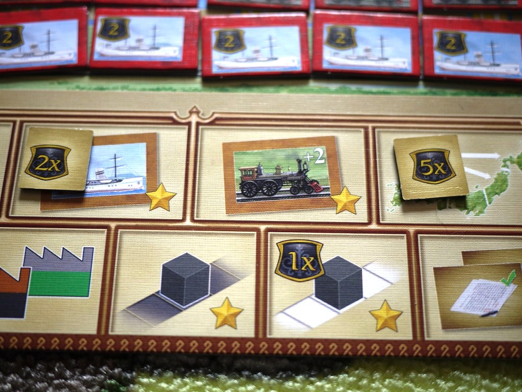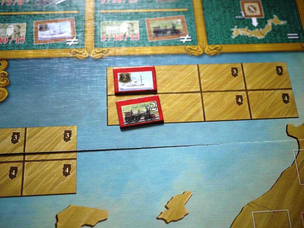 ・船タイルの配置:個人ボードから、1~3枚の船タイルをメインボードに置きます。配置ルールは機関車と同じですが、決算のときその地域からもらえる得点をプラスできます。