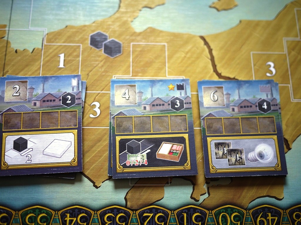 ・商品の生産:工場で商品を精算します。右上に、生産に必要な石炭数が書いてありますので、この個数分支払って「1個」の製品を精算します。