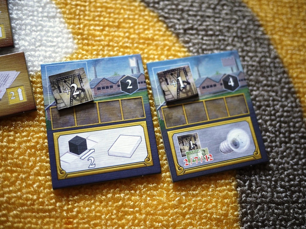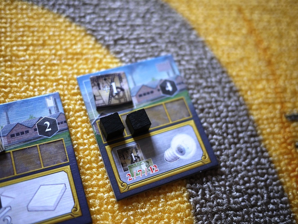 ・工場の購入:6,000円を支払って工場を1件購入できます。工場には知識レベルが2~6必要とされ、最初は全プレイヤー1なので、知識トラックを先に上昇させないと買えない・・・ と思いきや、最初に配られた1の青写真タイルを使うと知識レベルをあげられます。なので初手で買うことも可能。青写真は使い捨て。
