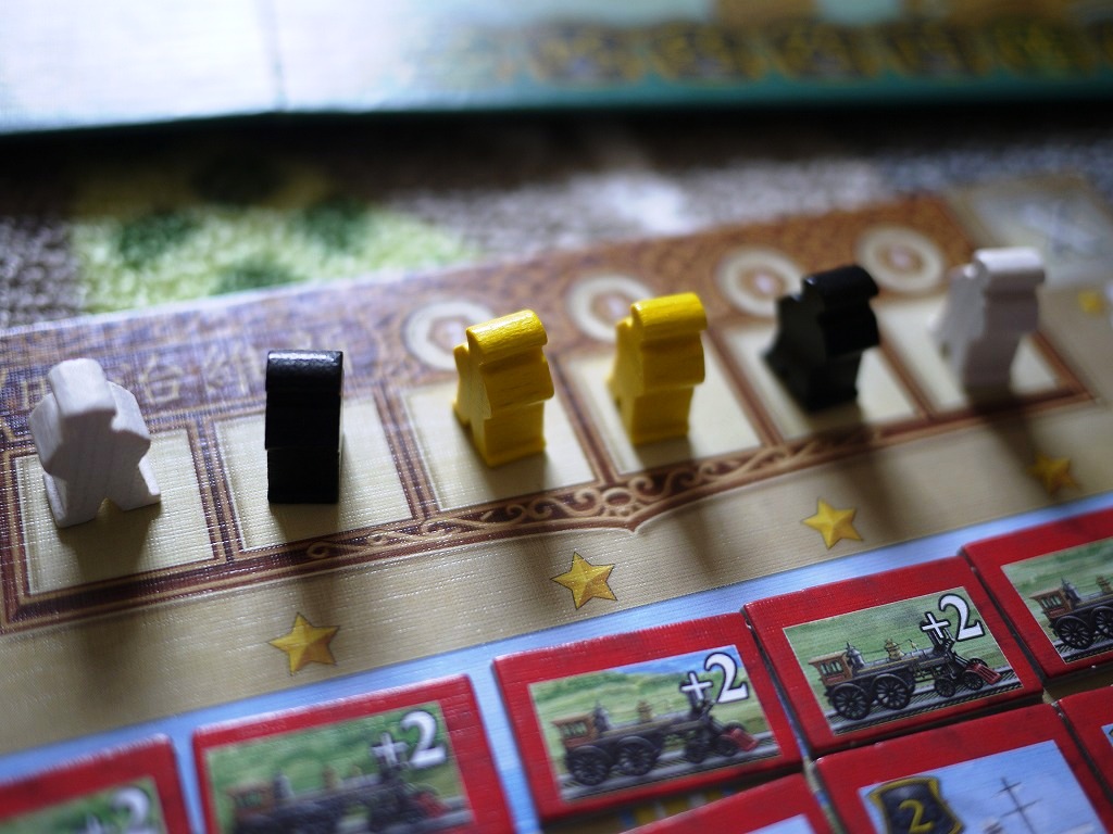 ・機関車タイルの配置:個人ボードから、1~3枚の機関車タイルをメインボードに置きます。このとき、1手番で同じ地域にまとめて置くのはダメです。 この機関車タイルは、その地域の自分の影響力を底上げします。