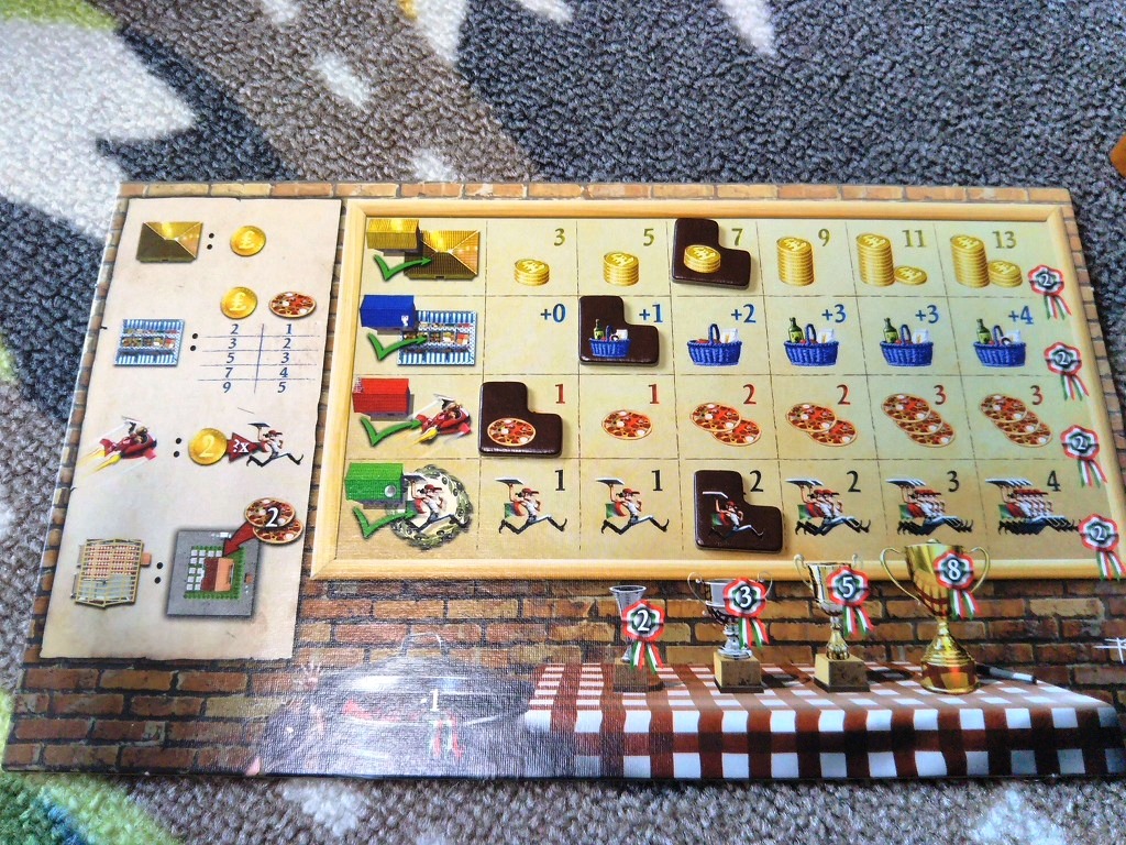配達した結果、一つのタイルの色つき屋根に全て配れたら対応した色の能力レベルが上がります。(個人ボードのやつね) ピザを焼くときボーナスがついたり、単純にアクションでもらえるお金が増えたりします。