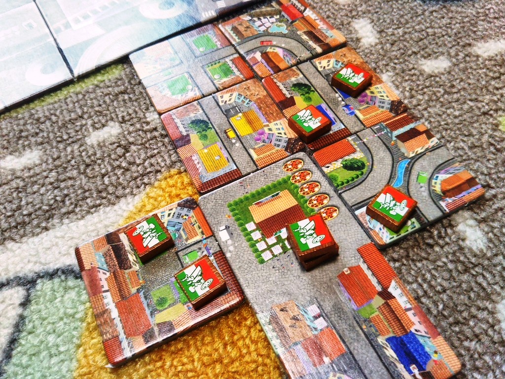 自分の前に作った町には、色のついた屋根が書いてあります。これらがピザを欲している家で、タイルに描かれた距離と枚数の上限まで、ピザを配達できるのです。