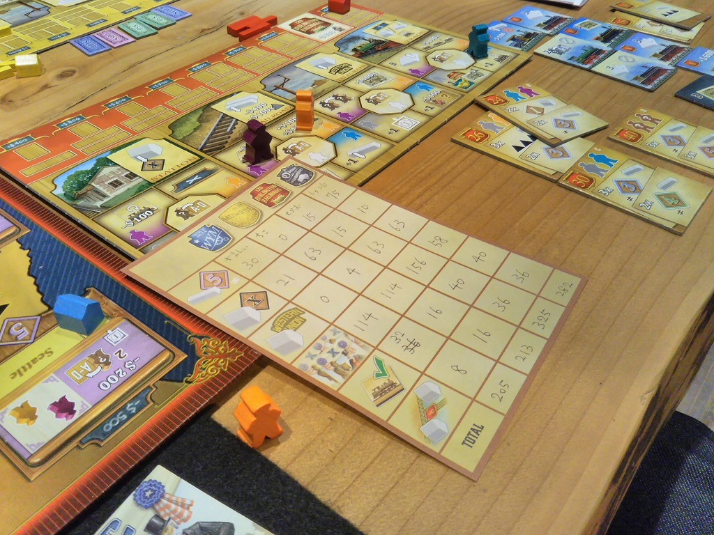 前述の終了フラグを誰かが切ったら、最終手番のプレイヤーまで手番を行った後、「もう一周」してゲーム終了。得点シートを使って計算します。結構派手な得点が入るゲームです。慣れると契約タイルの得点が大きい。